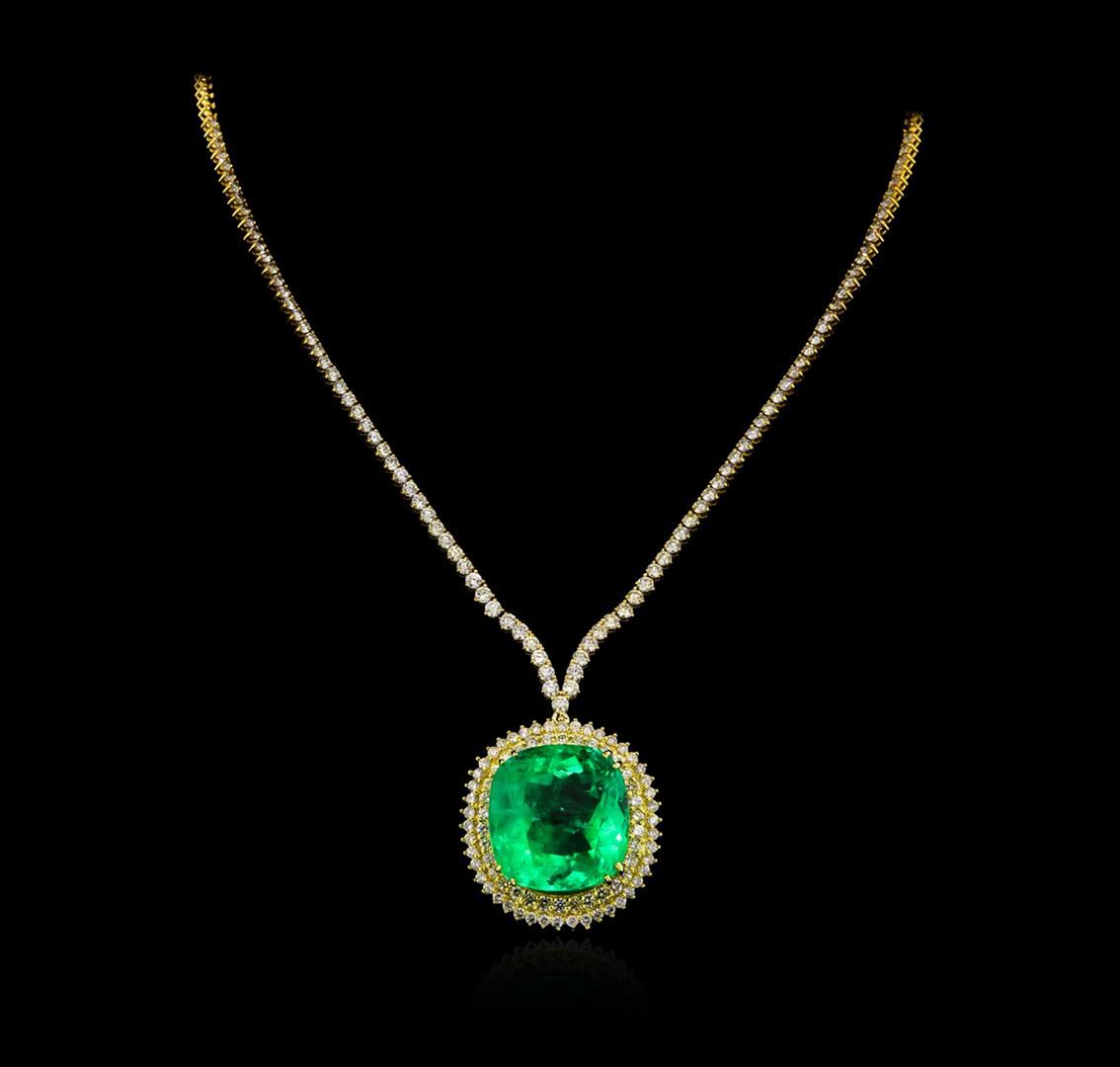 One electronically tested 18KT yellow gold ladies cast & assembled emerald and diamond necklace. Seventeen inch length necklace features a pendant consisting of an emerald set within tiered diamond bezels supported by a chevron style diamond ribbon transitioning into matching yellow gold links, terminating in a conceal clasp with safety. Bright polish finish. Identified with markings of "18K". Condition is new, good workmanship. Containing: One prong set cushion modified brilliant cut natural emerald, measuring 23.01 x 22.07 x 15.26mm, exact weight 49.47ct., clarity is heavily included, type III, medium dark, very slightly grayish, green color, (GIA G 6/3), cut is good. Transmitting light with a minimum of distortion, transparent. Naturally occurring internal & external characteristics are present. Moderate clarity enhancement. GIA Gemological Report attached. Graded loose prior to setting in the GIA Laboratory, Report #2175051732.One Hundred Seventy-Five prong set round brilliant cut diamonds, measuring 2.60 - 2.00 x 1.38mm (depth est.) approximate total weight of 175 Stones = 7.88ct. Graded in the setting. Clarity: VS-2 to SI-2. Color: G - I. Total Weight of Colored Stones 49.47ct. Total Weight of Diamonds 7.88ct. Total Weight of Necklace 43.68 grams. AIG Appraised at $204,185.00.