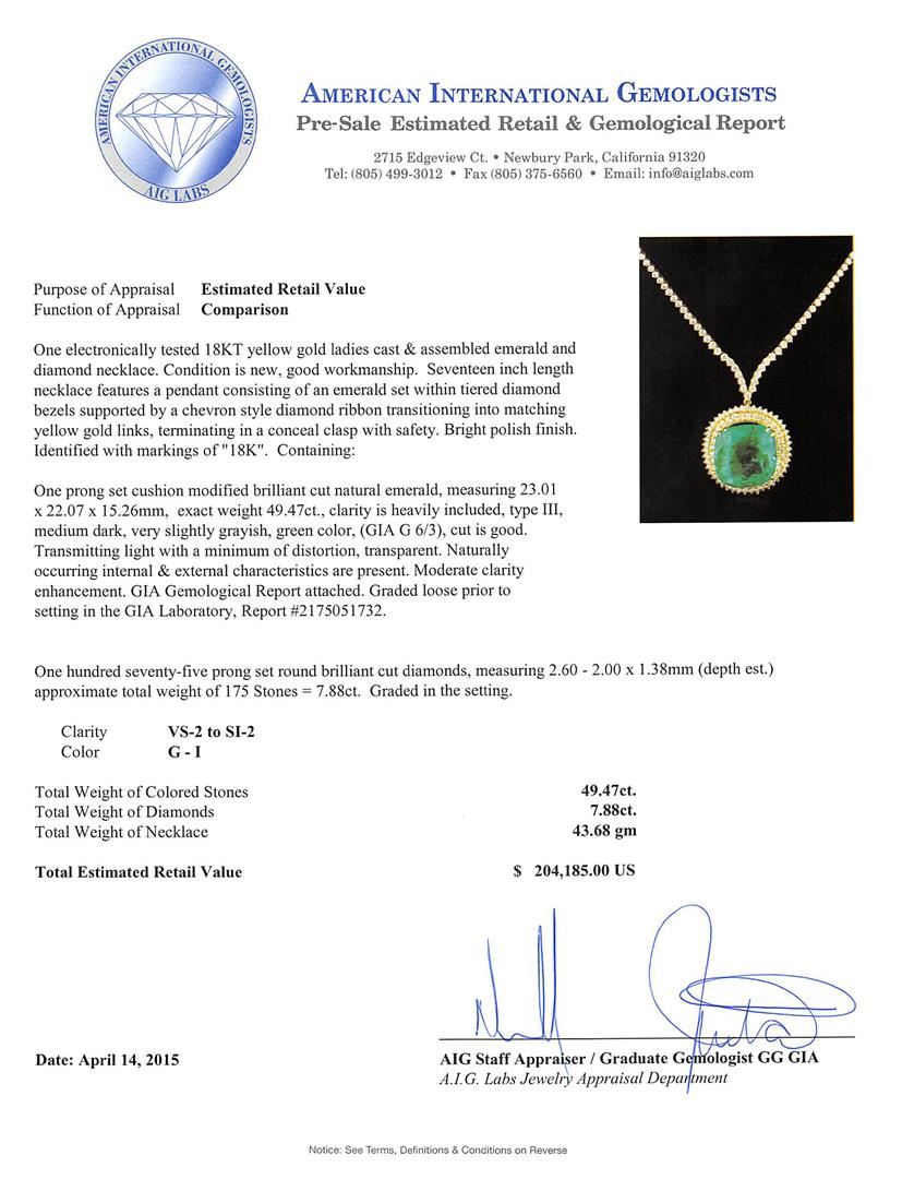 One electronically tested 18KT yellow gold ladies cast & assembled emerald and diamond necklace. Seventeen inch length necklace features a pendant consisting of an emerald set within tiered diamond bezels supported by a chevron style diamond ribbon transitioning into matching yellow gold links, terminating in a conceal clasp with safety. Bright polish finish. Identified with markings of "18K". Condition is new, good workmanship. Containing: One prong set cushion modified brilliant cut natural emerald, measuring 23.01 x 22.07 x 15.26mm, exact weight 49.47ct., clarity is heavily included, type III, medium dark, very slightly grayish, green color, (GIA G 6/3), cut is good. Transmitting light with a minimum of distortion, transparent. Naturally occurring internal & external characteristics are present. Moderate clarity enhancement. GIA Gemological Report attached. Graded loose prior to setting in the GIA Laboratory, Report #2175051732.One Hundred Seventy-Five prong set round brilliant cut diamonds, measuring 2.60 - 2.00 x 1.38mm (depth est.) approximate total weight of 175 Stones = 7.88ct. Graded in the setting. Clarity: VS-2 to SI-2. Color: G - I. Total Weight of Colored Stones 49.47ct. Total Weight of Diamonds 7.88ct. Total Weight of Necklace 43.68 grams. AIG Appraised at $204,185.00.