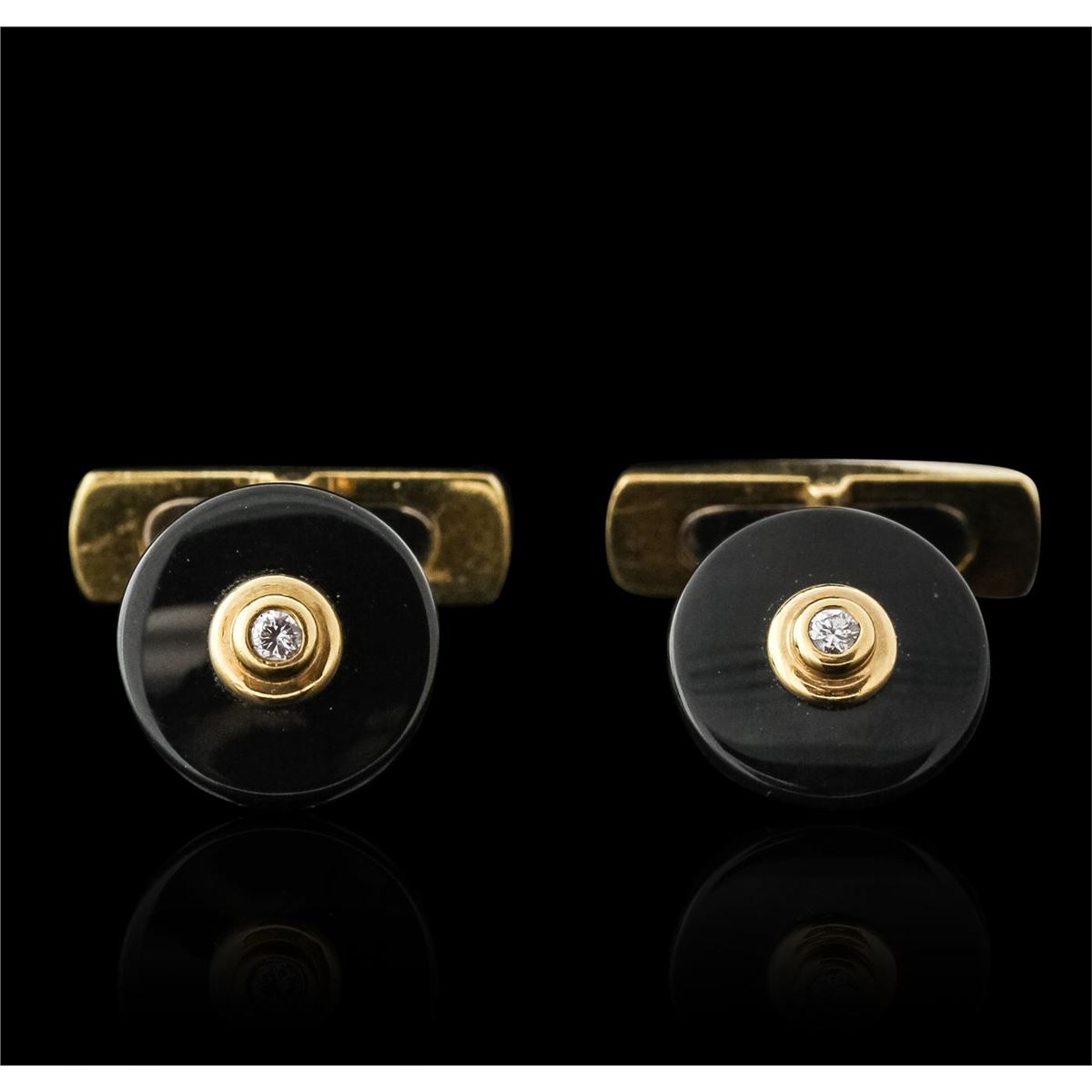 One pair of cuff links featuring: 18KT yellow gold weighing 10.30 grams containing black onyxs and two round diamond center stones with a total weight of 0.18cts. 40443.