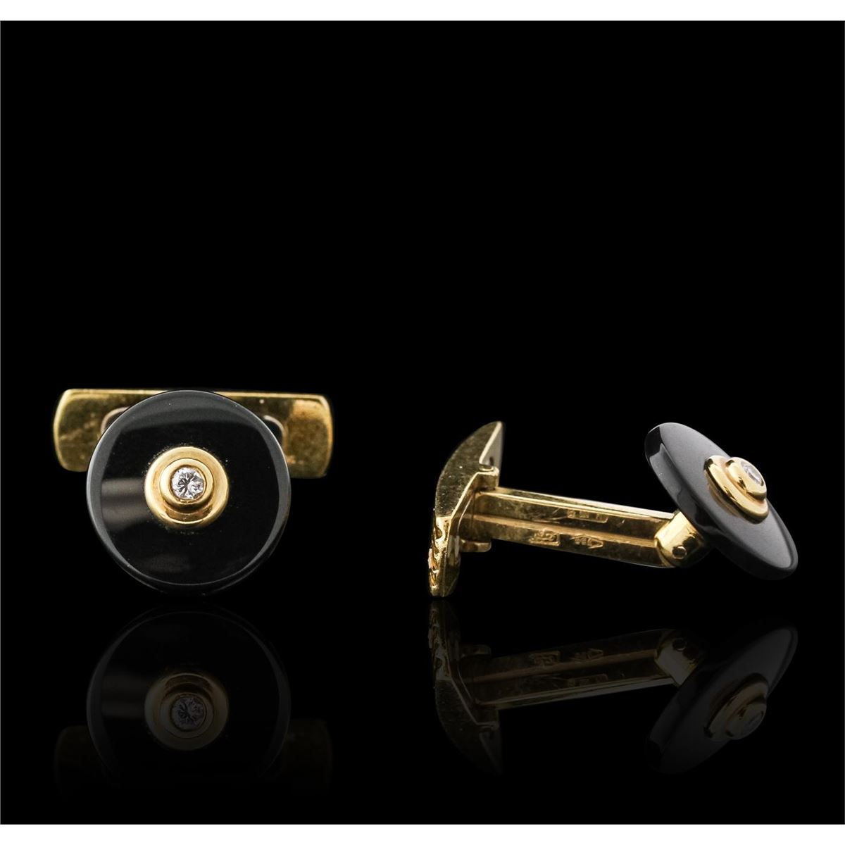 One pair of cuff links featuring: 18KT yellow gold weighing 10.30 grams containing black onyxs and two round diamond center stones with a total weight of 0.18cts. 40443.