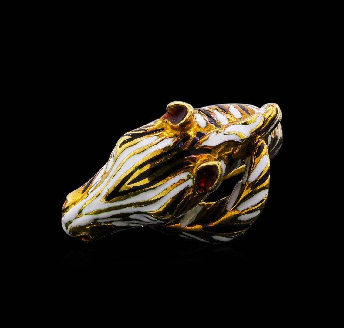 One electronically tested 18KT yellow gold ladies custom cast "zebra" ring with a bright polish finish. The ring features a zebra motif by Hammerman Brothers. The head and mane of the zebra are accented by black and white classic enamel stripes, while the inside of the ears and nostrils are accented by red enamel. The four millimeter wide band of the ring continues the same black and white enamel striping. The band curves around to the side of the zebra head creating the look of the zebra's tail. Ring size 6. Trademark is HB. Identified with markings of "18K". Condition is good. Total Weight of Ring 16.19gm. AIG Appraised.