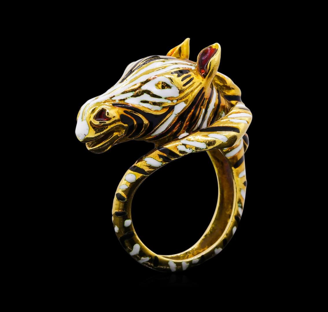 One electronically tested 18KT yellow gold ladies custom cast "zebra" ring with a bright polish finish. The ring features a zebra motif by Hammerman Brothers. The head and mane of the zebra are accented by black and white classic enamel stripes, while the inside of the ears and nostrils are accented by red enamel. The four millimeter wide band of the ring continues the same black and white enamel striping. The band curves around to the side of the zebra head creating the look of the zebra's tail. Ring size 6. Trademark is HB. Identified with markings of "18K". Condition is good. Total Weight of Ring 16.19gm. AIG Appraised.