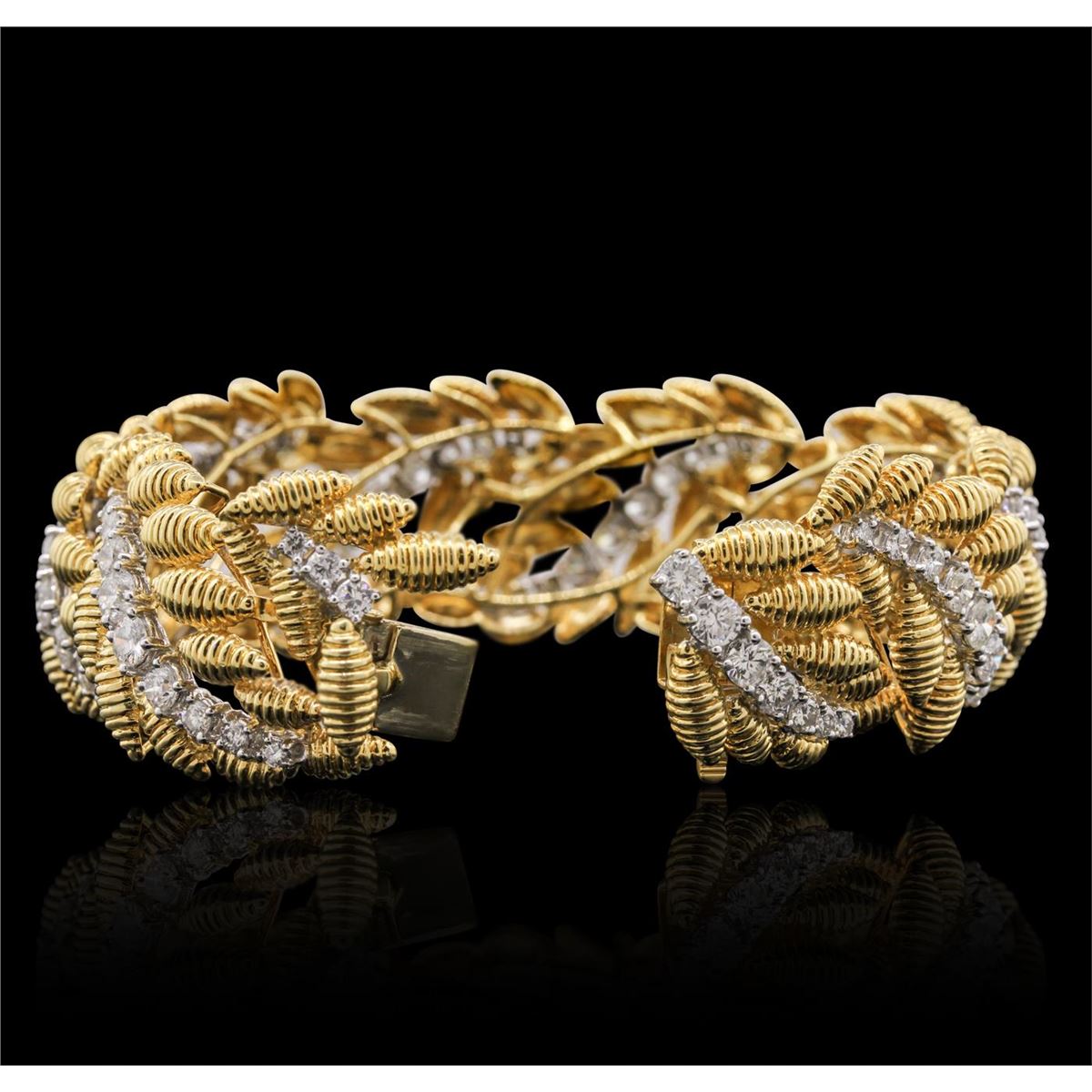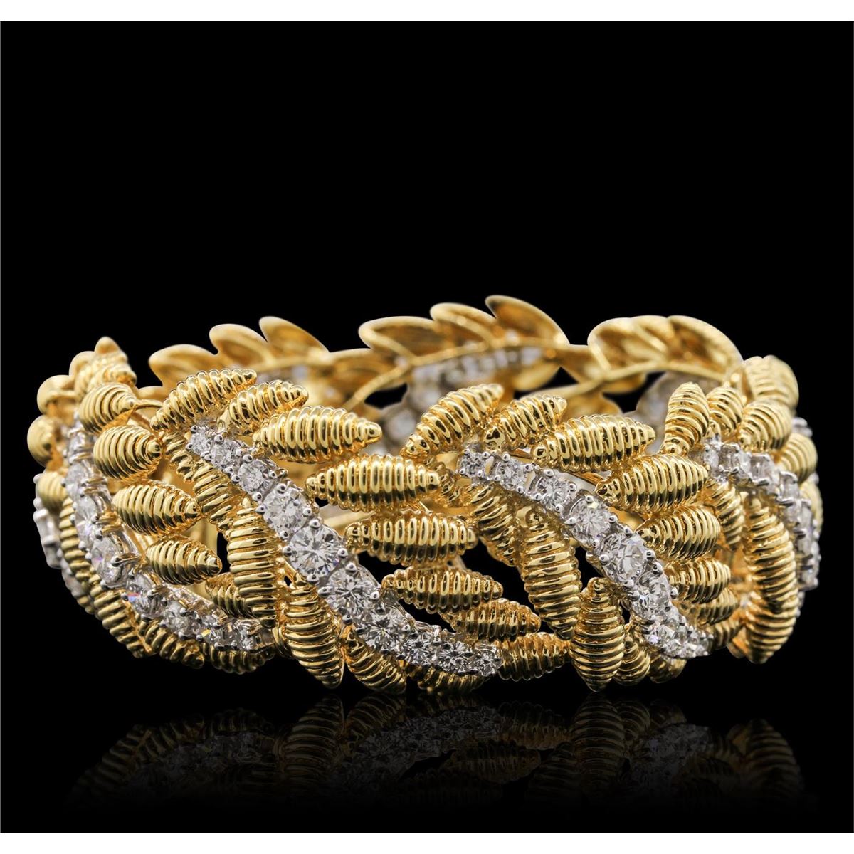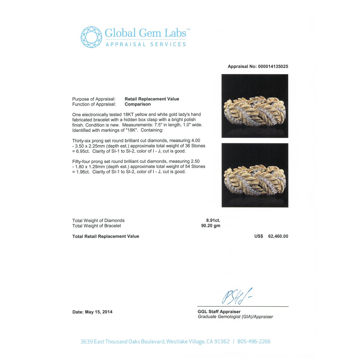 One electronically tested 18KT yellow and white gold Ladies hand fabricated bracelet with a hidden box clasp with a bright polish finish. Measurements: 7.5" in length, 1.0" wide. Identified with markings of "18K". Condition is new. Containing: Thirty-Six prong set round brilliant cut diamonds, measuring 4.00 - 3.50 x 2.25mm (depth est.) approximate. Total Weight of 36 Stones = 6.95ct. Clarity: SI-1 to SI-2. Color: I - J, Cut is Good. Fifty-Four prong set round brilliant cut diamonds, measuring 2.50 - 1.80 x 1.29mm (depth est.) approximate. Total Weight of 54 Stones = 1.96ct. Clarity: SI-1 to SI-2. Color: I - J, Cut is Good. Total Weight of Diamonds 8.91ct. Total Weight of Bracelet 90.20 grams. GGL Appraised at $62,460.00.