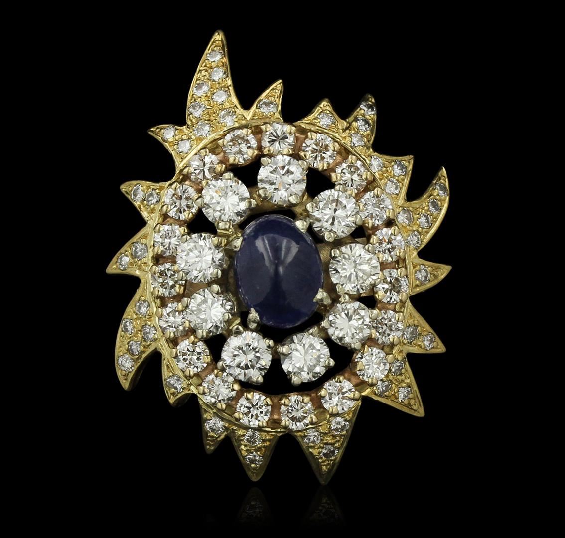 One electronically tested 18KT and 14KT yellow gold ladies cast & assembled sapphire and diamond ring with a bright polish finish. Condition is new, good workmanship. The featured sapphire is set within an 18KT yellow gold diamond set stylized sunburst, completed by a 14KT yellow gold three and one-half millimeter wide band. Containing: One prong set oval cabochon cut natural blue sapphire, measuring 9.00 x 7.00 x 4.55mm, approximate weight of 3.20ct., clarity is moderately included, type II, medium, moderately strong, violetish blue color, (GIA vB 5/4), cut is good. Transmitting light somewhat diffusely, transparent to translucent. Naturally occurring internal & external characteristics are present. Refractive index testing results of 1.76 to 1.77. This is a conclusive result for corundum (sapphire). Nine prong set round brilliant cut diamonds, measuring 3.90 - 3.70 x 2.28mm (depth est.) approximate total weight of 9 Stones = 1.90ct. Graded in the setting. Clarity SI-1 to SI-2 Color G -- I. Nineteen prong set round brilliant cut diamonds, measuring 2.80 - 2.70 x 1.65mm (depth est.) approximate total weight of 19 Stones = 1.55ct. Graded in the setting. Clarity VS-2 to SI-2 Color G -- I. Forty-Four bead set round brilliant cut diamonds, measuring 1.60 - 1.50 x 0.93mm (depth est.) approximate total weight of 44 Stones = 0.68ct. Graded in the setting. Clarity VVS-2 to VS-2. Color G -- I. Total Weight of Colored Stones 3.20 ct. Total Weight of Diamonds 4.13 ct. Total Weight of Ring 19.18 grams. AIG Appraised at $23,190.00.