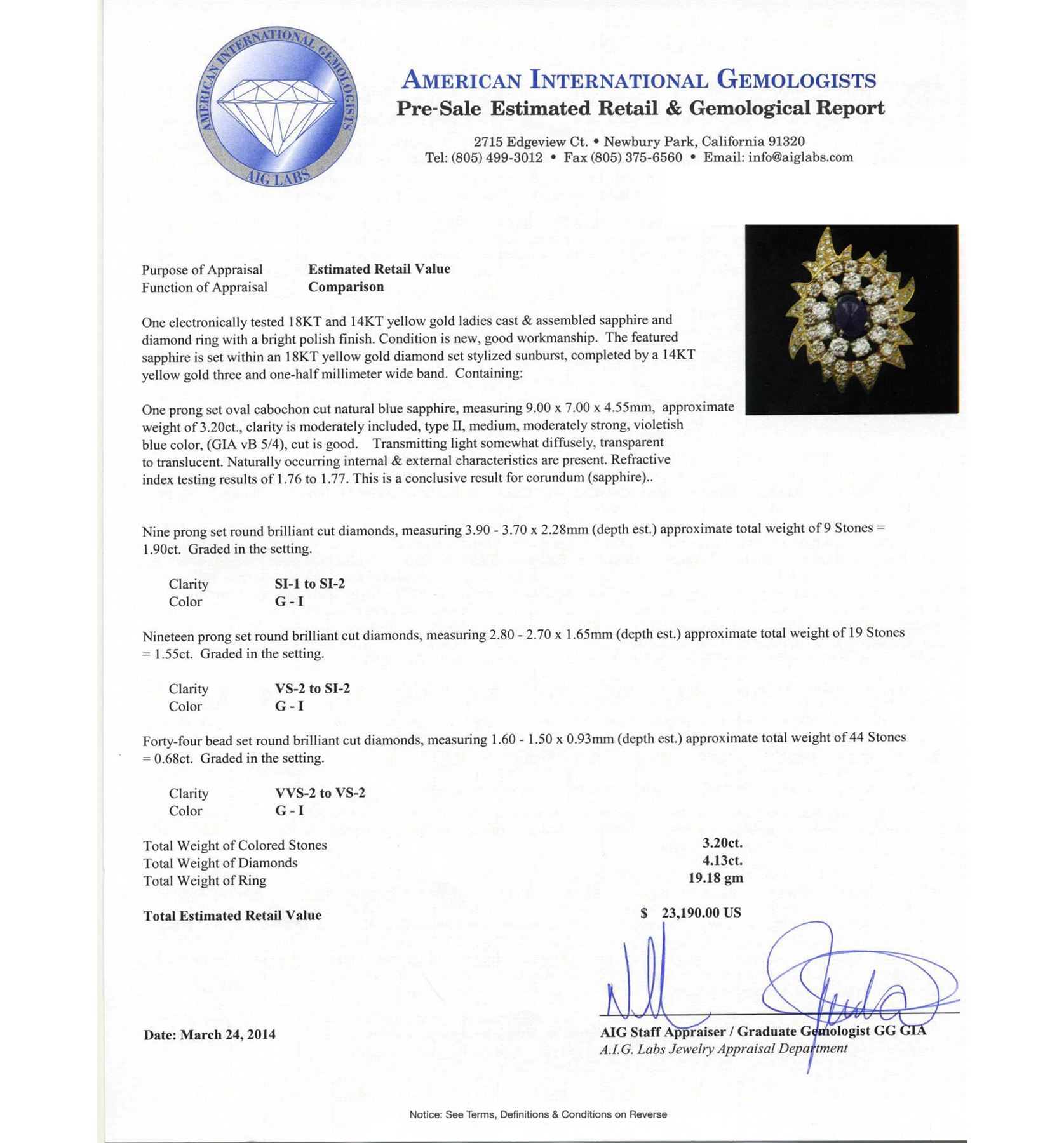 One electronically tested 18KT and 14KT yellow gold ladies cast & assembled sapphire and diamond ring with a bright polish finish. Condition is new, good workmanship. The featured sapphire is set within an 18KT yellow gold diamond set stylized sunburst, completed by a 14KT yellow gold three and one-half millimeter wide band. Containing: One prong set oval cabochon cut natural blue sapphire, measuring 9.00 x 7.00 x 4.55mm, approximate weight of 3.20ct., clarity is moderately included, type II, medium, moderately strong, violetish blue color, (GIA vB 5/4), cut is good. Transmitting light somewhat diffusely, transparent to translucent. Naturally occurring internal & external characteristics are present. Refractive index testing results of 1.76 to 1.77. This is a conclusive result for corundum (sapphire). Nine prong set round brilliant cut diamonds, measuring 3.90 - 3.70 x 2.28mm (depth est.) approximate total weight of 9 Stones = 1.90ct. Graded in the setting. Clarity SI-1 to SI-2 Color G -- I. Nineteen prong set round brilliant cut diamonds, measuring 2.80 - 2.70 x 1.65mm (depth est.) approximate total weight of 19 Stones = 1.55ct. Graded in the setting. Clarity VS-2 to SI-2 Color G -- I. Forty-Four bead set round brilliant cut diamonds, measuring 1.60 - 1.50 x 0.93mm (depth est.) approximate total weight of 44 Stones = 0.68ct. Graded in the setting. Clarity VVS-2 to VS-2. Color G -- I. Total Weight of Colored Stones 3.20 ct. Total Weight of Diamonds 4.13 ct. Total Weight of Ring 19.18 grams. AIG Appraised at $23,190.00.