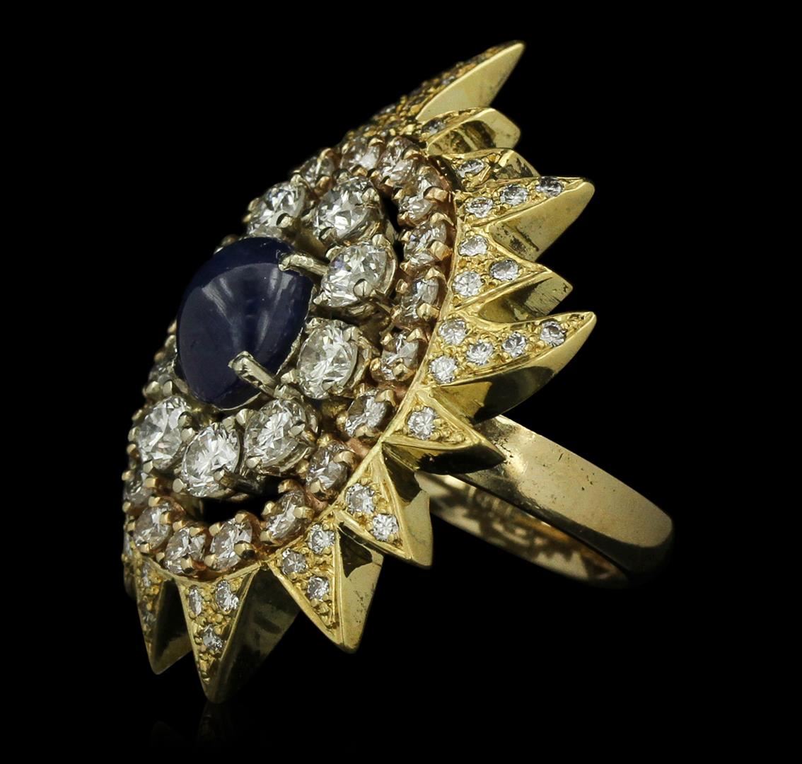 One electronically tested 18KT and 14KT yellow gold ladies cast & assembled sapphire and diamond ring with a bright polish finish. Condition is new, good workmanship. The featured sapphire is set within an 18KT yellow gold diamond set stylized sunburst, completed by a 14KT yellow gold three and one-half millimeter wide band. Containing: One prong set oval cabochon cut natural blue sapphire, measuring 9.00 x 7.00 x 4.55mm, approximate weight of 3.20ct., clarity is moderately included, type II, medium, moderately strong, violetish blue color, (GIA vB 5/4), cut is good. Transmitting light somewhat diffusely, transparent to translucent. Naturally occurring internal & external characteristics are present. Refractive index testing results of 1.76 to 1.77. This is a conclusive result for corundum (sapphire). Nine prong set round brilliant cut diamonds, measuring 3.90 - 3.70 x 2.28mm (depth est.) approximate total weight of 9 Stones = 1.90ct. Graded in the setting. Clarity SI-1 to SI-2 Color G -- I. Nineteen prong set round brilliant cut diamonds, measuring 2.80 - 2.70 x 1.65mm (depth est.) approximate total weight of 19 Stones = 1.55ct. Graded in the setting. Clarity VS-2 to SI-2 Color G -- I. Forty-Four bead set round brilliant cut diamonds, measuring 1.60 - 1.50 x 0.93mm (depth est.) approximate total weight of 44 Stones = 0.68ct. Graded in the setting. Clarity VVS-2 to VS-2. Color G -- I. Total Weight of Colored Stones 3.20 ct. Total Weight of Diamonds 4.13 ct. Total Weight of Ring 19.18 grams. AIG Appraised at $23,190.00.