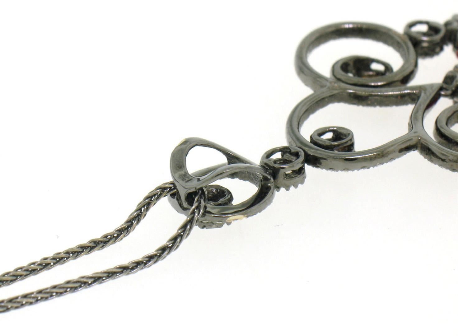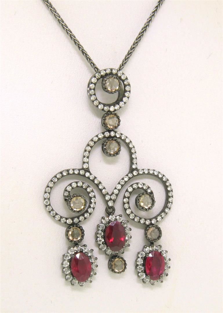 An estate solid 18k white gold and balck rhodium pendant necklace, with 3 oval cut natural rubies (1.80ctw), 147 round brilliant cut natural diamonds (G-H - SI1-SI2 ; 1.47ctw), and 8 rose cut natural diamonds (1.12ctw).The pendant weighs a total of 8.90 grams, measures 45x26mm including the bail, and 18 inch wheat link chain.