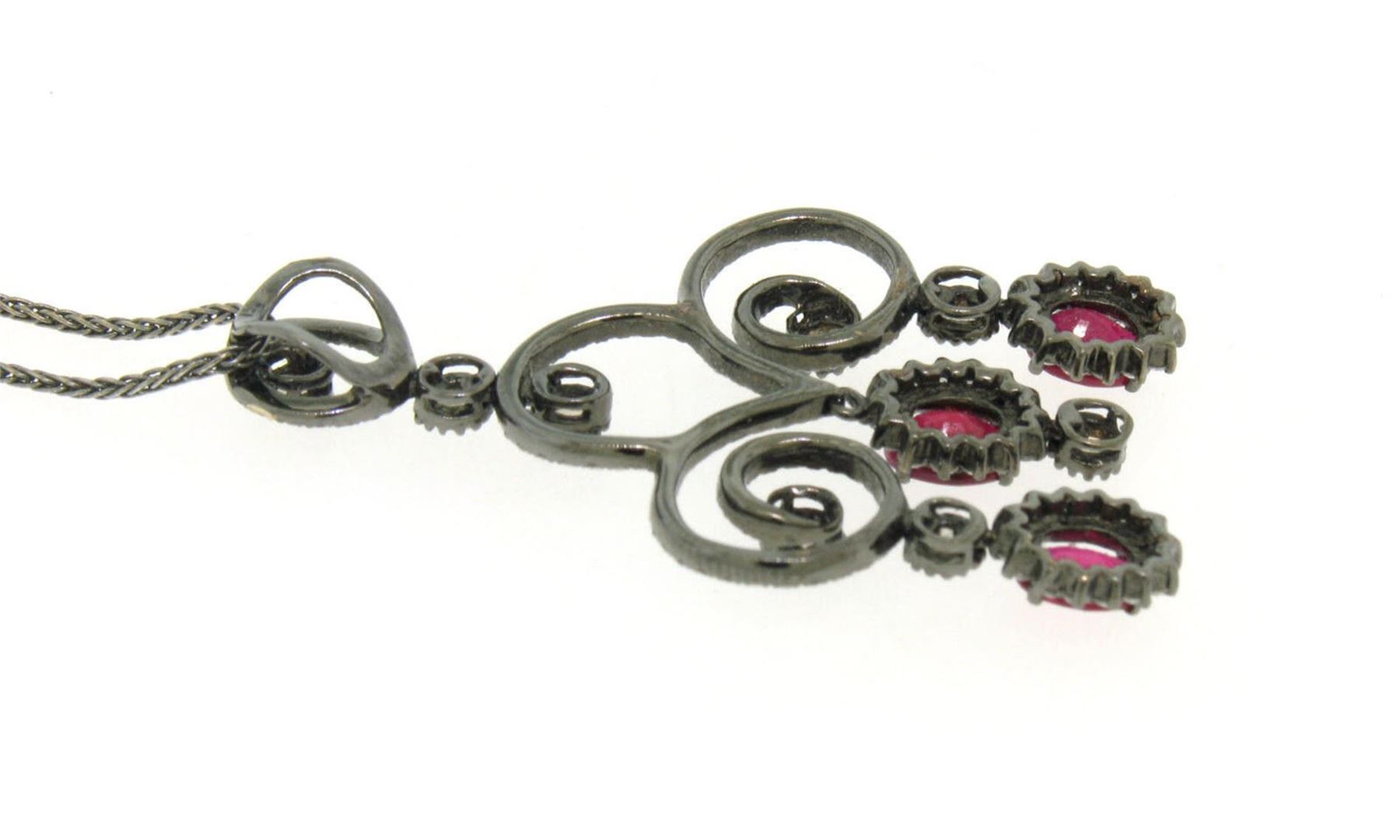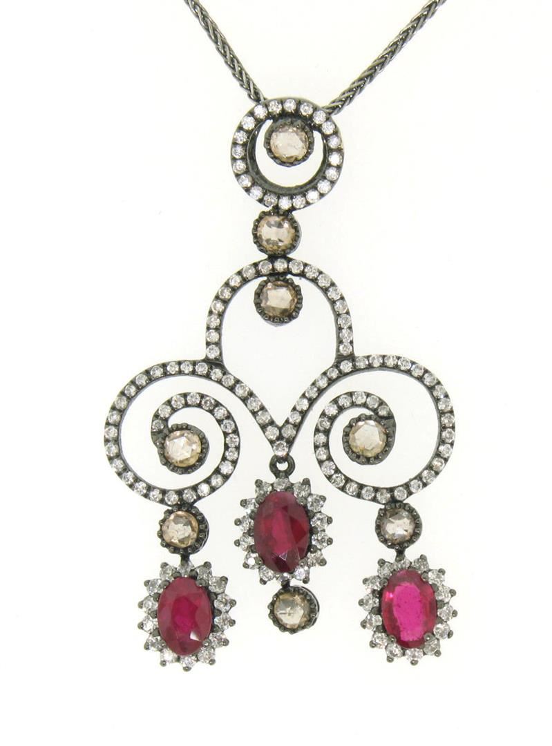 An estate solid 18k white gold and balck rhodium pendant necklace, with 3 oval cut natural rubies (1.80ctw), 147 round brilliant cut natural diamonds (G-H - SI1-SI2 ; 1.47ctw), and 8 rose cut natural diamonds (1.12ctw).The pendant weighs a total of 8.90 grams, measures 45x26mm including the bail, and 18 inch wheat link chain.