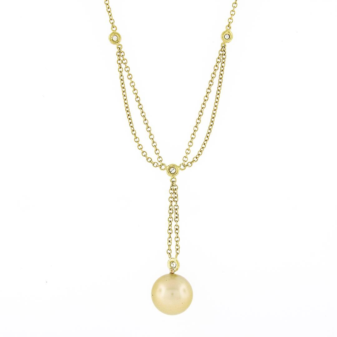A solid 18k yellow gold dangle chain necklace, with 1 round shape golden cultured pearl (11.7mm), and 4 round brilliant cut natural diamonds (F/G - VS1/VS2 ; 0.12ctw). Adjustable 14.5 and16.5 inch single & dual cable link chain, 6.01 grams total weight, d