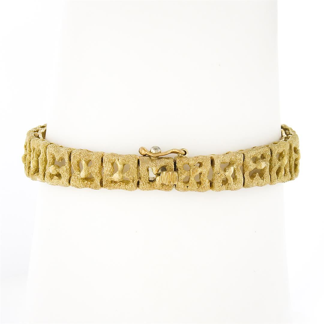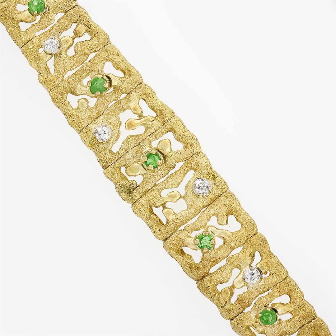 A solid 18k yellow gold strap bracelet, with 4 round brilliant cut natural diamonds (G/H Color - VS2 Clarity - 0.16ctw), and 5 round brilliant cut natural emeralds (0.35ctw). It weighs a total of 39.31 grams, measures 14.45mm wide, and measures 6.5 inches in length.