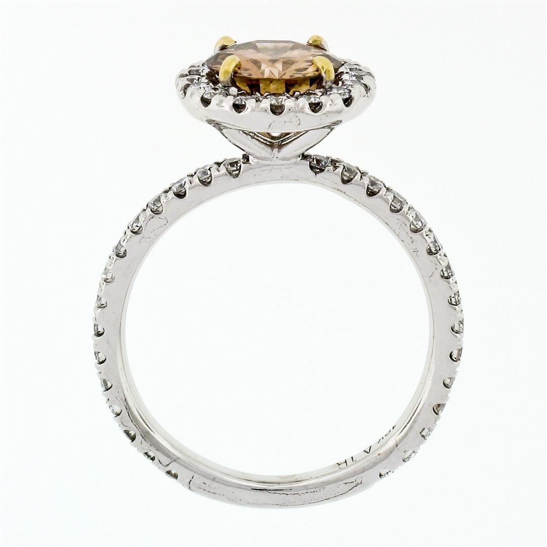 An estate solid 18k white and yellow gold solitaire engagement ring, with 1 Gia certified round brilliant cut natural diamond (Fancy Dark Orange-Brown - SI1; 1.06 ct), and a halo of 46 round brilliant cut natural diamonds (G/H- VS1/VS2; 0.50ctw). The ring is size 5.5, weighs a total of 3.43 grams, and measures 10.35mm diameter. Comes with all original relevant certifications.