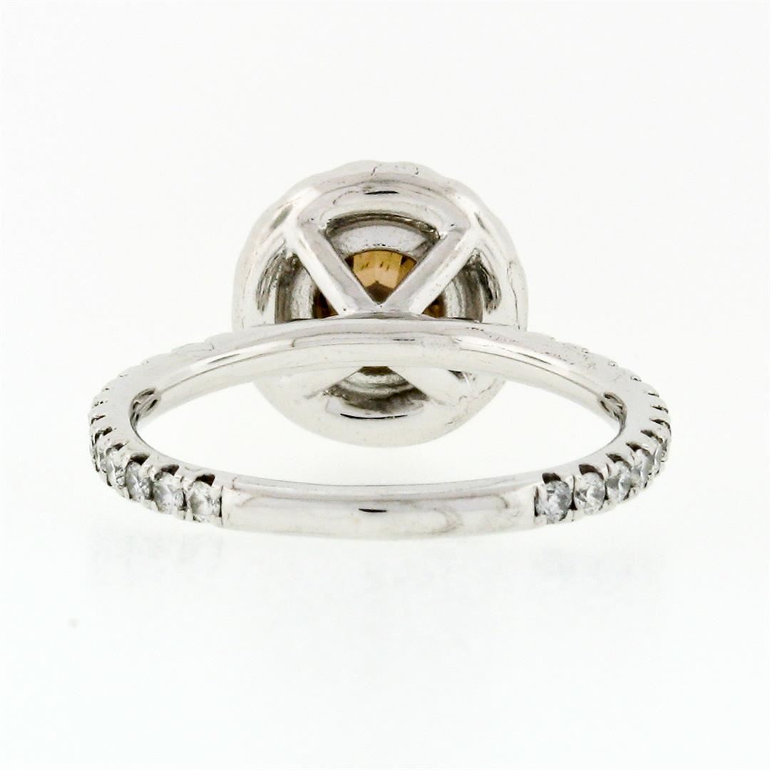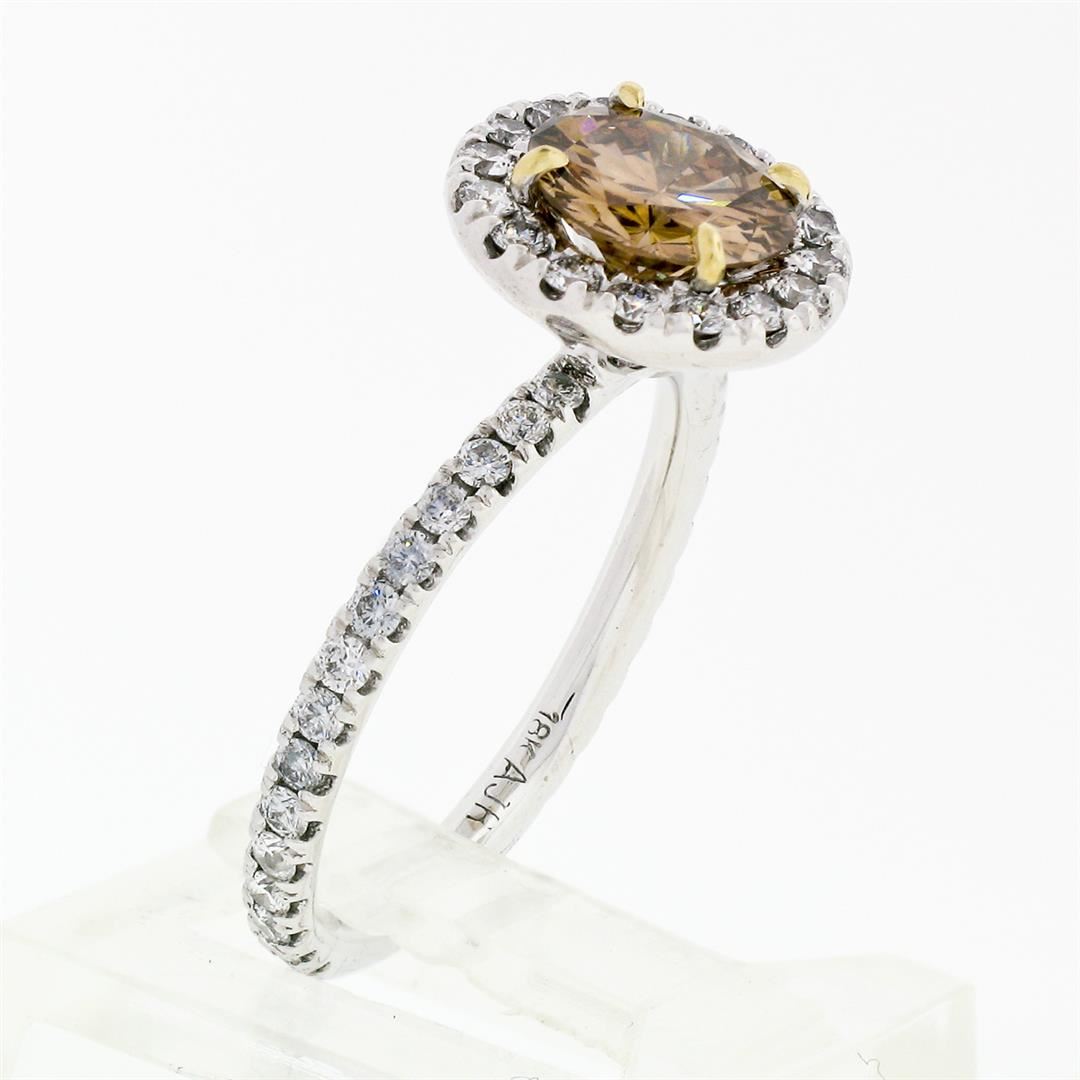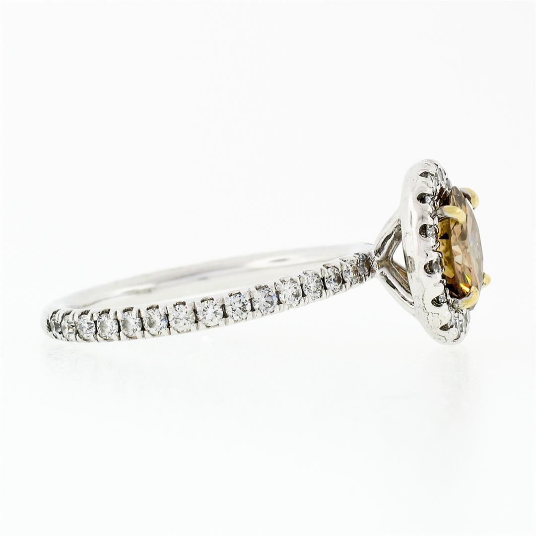 An estate solid 18k white and yellow gold solitaire engagement ring, with 1 Gia certified round brilliant cut natural diamond (Fancy Dark Orange-Brown - SI1; 1.06 ct), and a halo of 46 round brilliant cut natural diamonds (G/H- VS1/VS2; 0.50ctw). The ring is size 5.5, weighs a total of 3.43 grams, and measures 10.35mm diameter. Comes with all original relevant certifications.