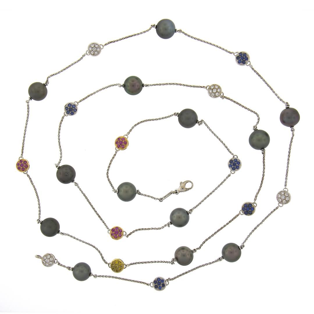 A solid 18k white & yellow gold station necklace, featuring 13 round shape gray cultured tahitian pearls (10.9-11.5mm), Numerous of round cut natural yellow, pink & blue sapphires (6ctw), and numerous of round cut natural diamonds (G/H - VS2-I1 ; 1.20ctw). It weighs a total of 54.11 grams, measures 11.5mm wide, and measures 46 inches in length.