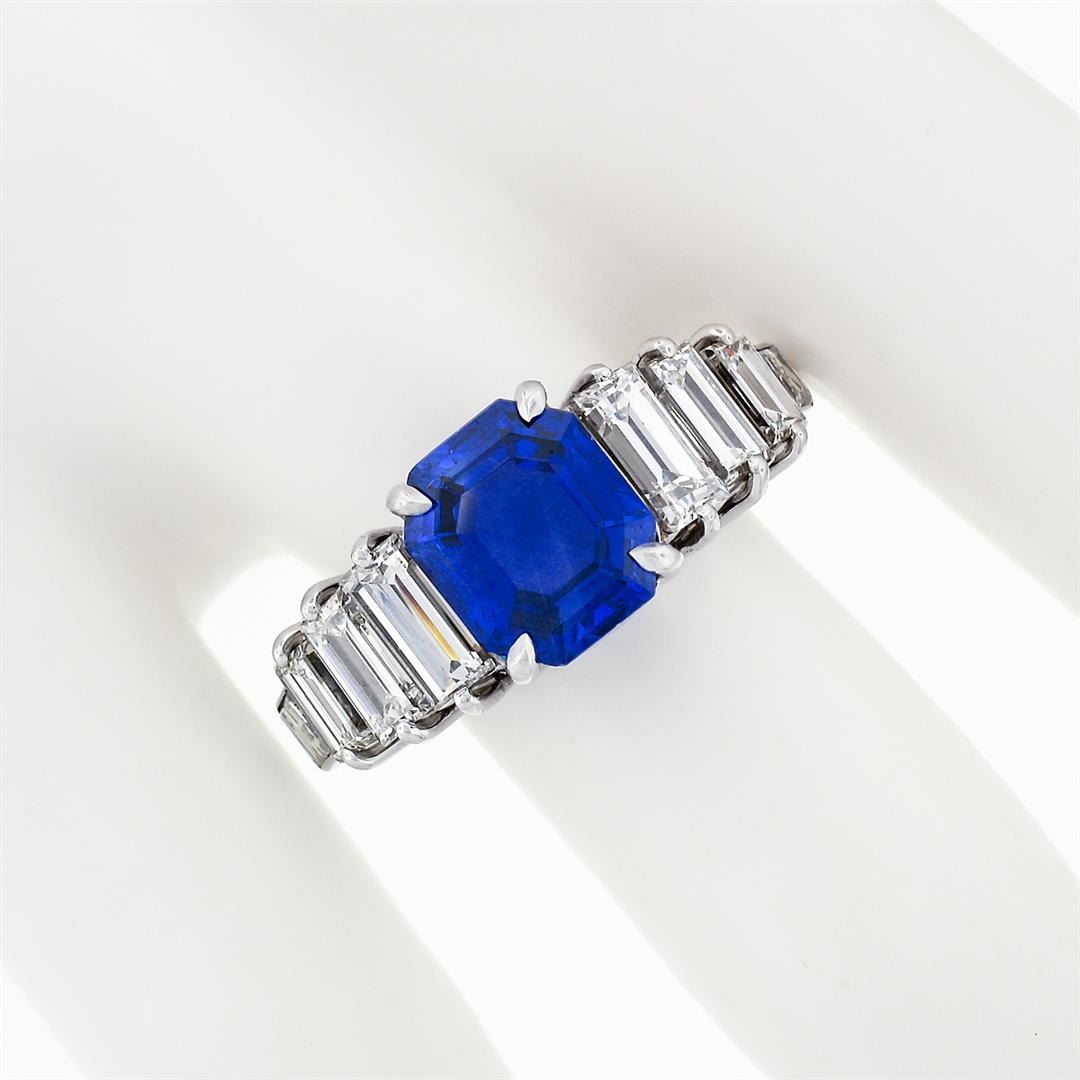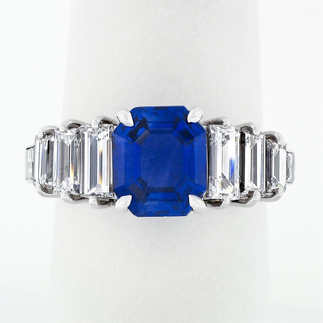 A vintage solid 18k white gold engagement statement ring , with 1 AGL certified emerald cut natural sapphire (3.41ct), and 8 straight baguette cut natural diamonds (F/G- VVS2/VS1; 2.50ctw). The ring is size 8.0, weighs a total of 6.05 grams, and measures 9.2mm wide. Comes with all original relevant certifications.