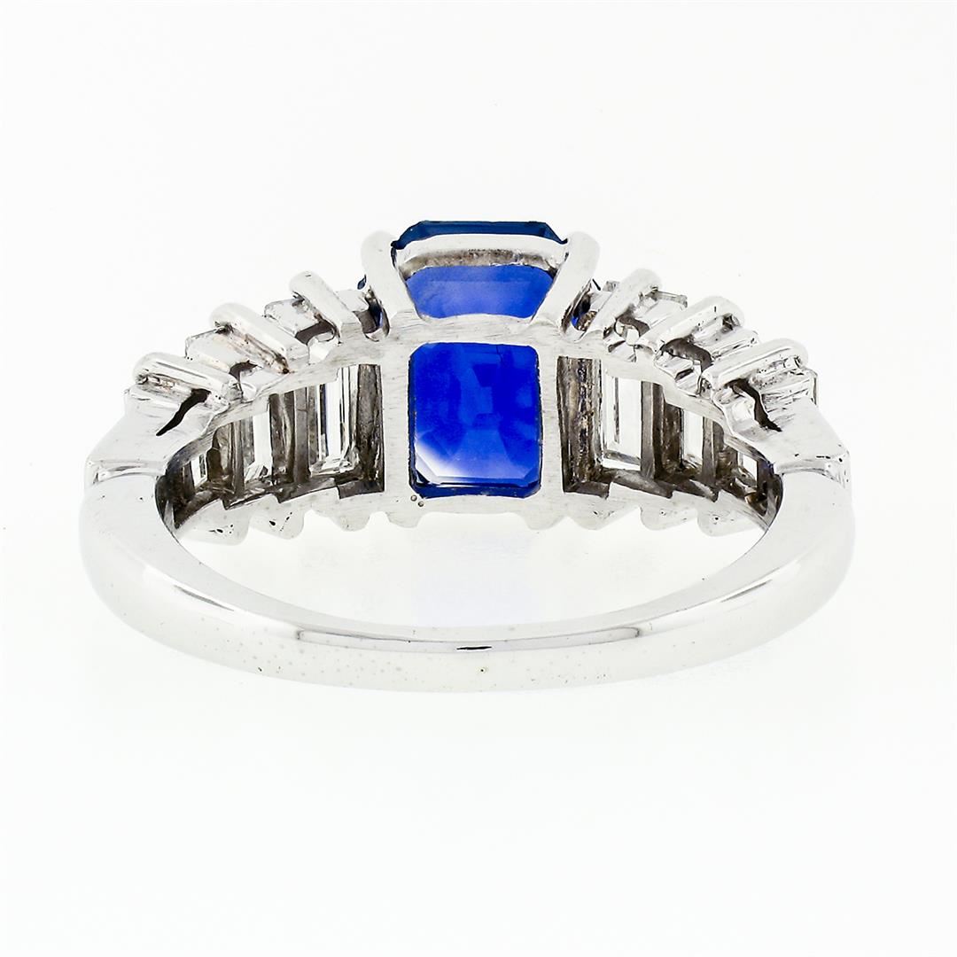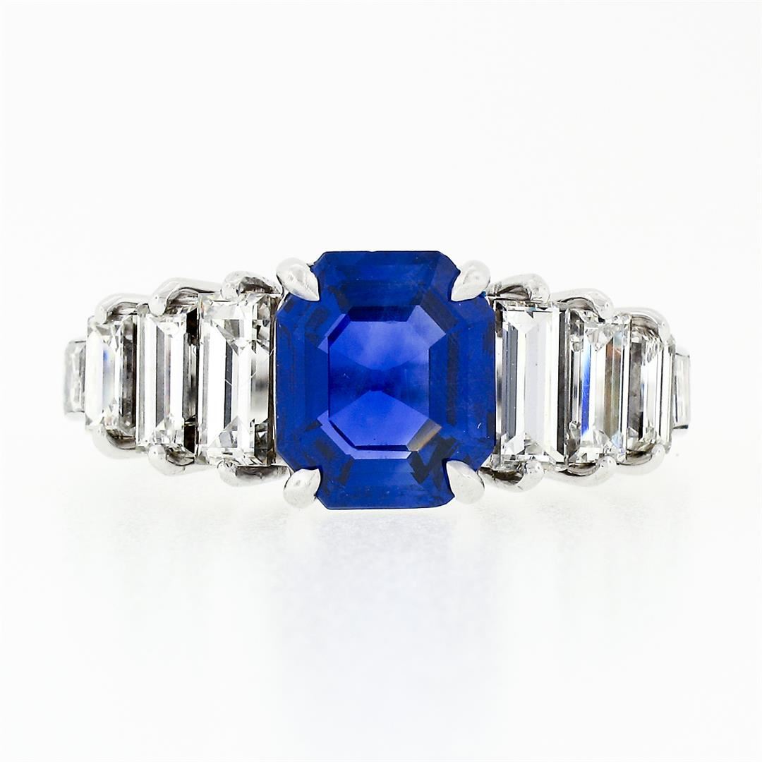 A vintage solid 18k white gold engagement statement ring , with 1 AGL certified emerald cut natural sapphire (3.41ct), and 8 straight baguette cut natural diamonds (F/G- VVS2/VS1; 2.50ctw). The ring is size 8.0, weighs a total of 6.05 grams, and measures 9.2mm wide. Comes with all original relevant certifications.