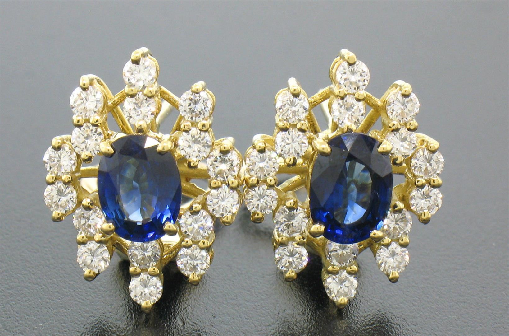 An estate solid 18k yellow gold earrings, with 2 EGL certified oval brillaint cut natural sapphires, and 32 round brilliant cut natural diamonds (E - VVS2; 1.12ctw). The earrings measure approximately 17.50x13.20mm and weigh a total of 9 grams. Comes with