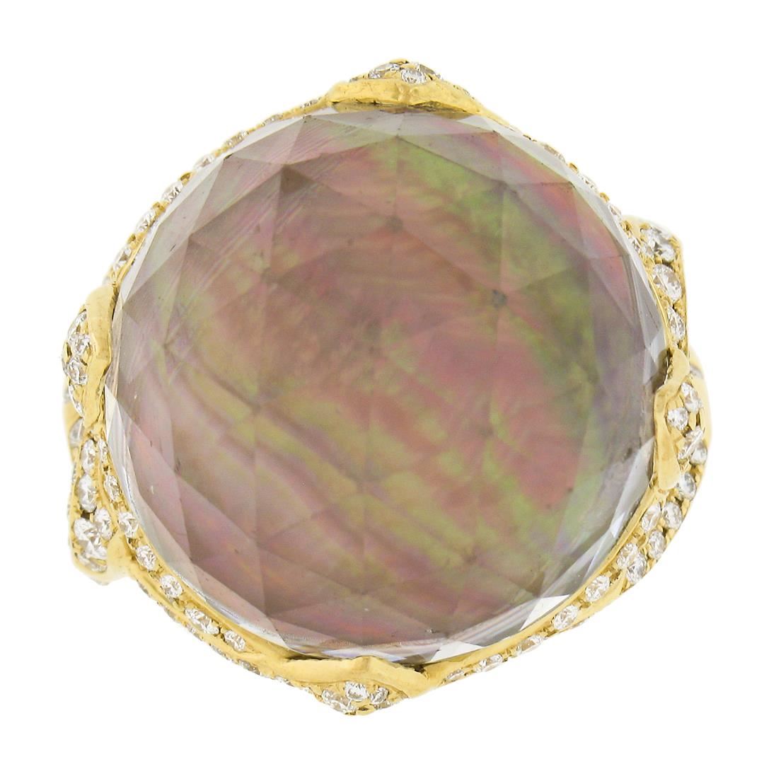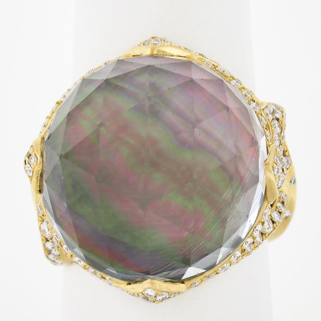 A solid 18k yellow gold ring, with 1 faceted round shape rock crystal on top of black mother of pearl (19.9mm), and numerous of round cut natural diamonds (F/G - VS1/VS2 ; 1.20ctw). The ring is size 9.0, weighs a total of 17.93 grams, and measures 23.2mm wide.