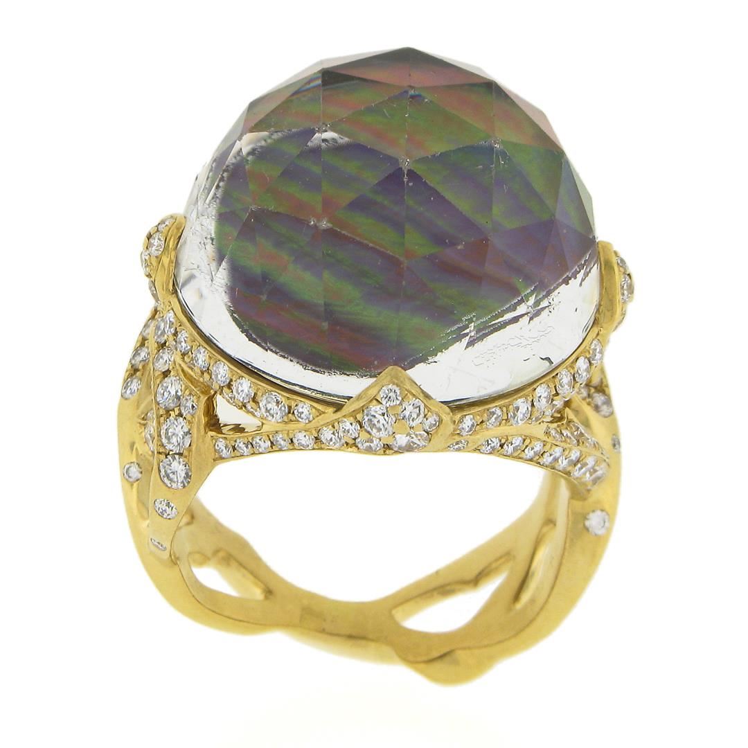 A solid 18k yellow gold ring, with 1 faceted round shape rock crystal on top of black mother of pearl (19.9mm), and numerous of round cut natural diamonds (F/G - VS1/VS2 ; 1.20ctw). The ring is size 9.0, weighs a total of 17.93 grams, and measures 23.2mm wide.