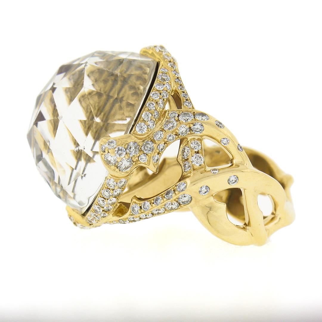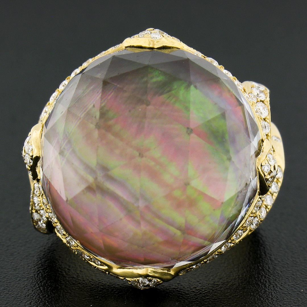 A solid 18k yellow gold ring, with 1 faceted round shape rock crystal on top of black mother of pearl (19.9mm), and numerous of round cut natural diamonds (F/G - VS1/VS2 ; 1.20ctw). The ring is size 9.0, weighs a total of 17.93 grams, and measures 23.2mm wide.