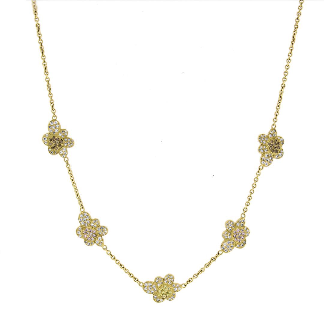 A solid 18k yellow gold station necklace, with GIA garded 11 fancy yellow colored natural diamonds (VS1-SI2), 150 round cut natural diamonds (F/G - VS1-SI1; 1.50ctw ), 22 round cut fancy bronw natrual diamonds (VS1-SI2), and 22 round cut fancy pink natural diamonds (VS1-SI2). It weighs a total of 13.26 grams, measures 11.1mm wide, and measures 16 inches in length. Comes with all original relevant certifications.
