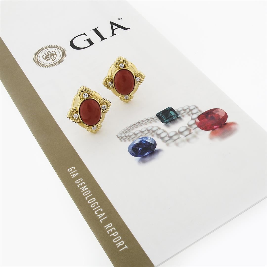 A solid 18k yellow gold clip on pair of earrings, with 2 Gia certified oval cabochon cut natural corals (13.77 x 9.95 x 4.60 mm and 13.79 x 10.04 x 4.62 mm), and 8 round brilliant cut natural diamonds (G- VS2; 0.12ctw). The earrings measure approximately 25.67x22.09mm and weigh a total of 17.24 grams. Comes with all original relevant certifications.