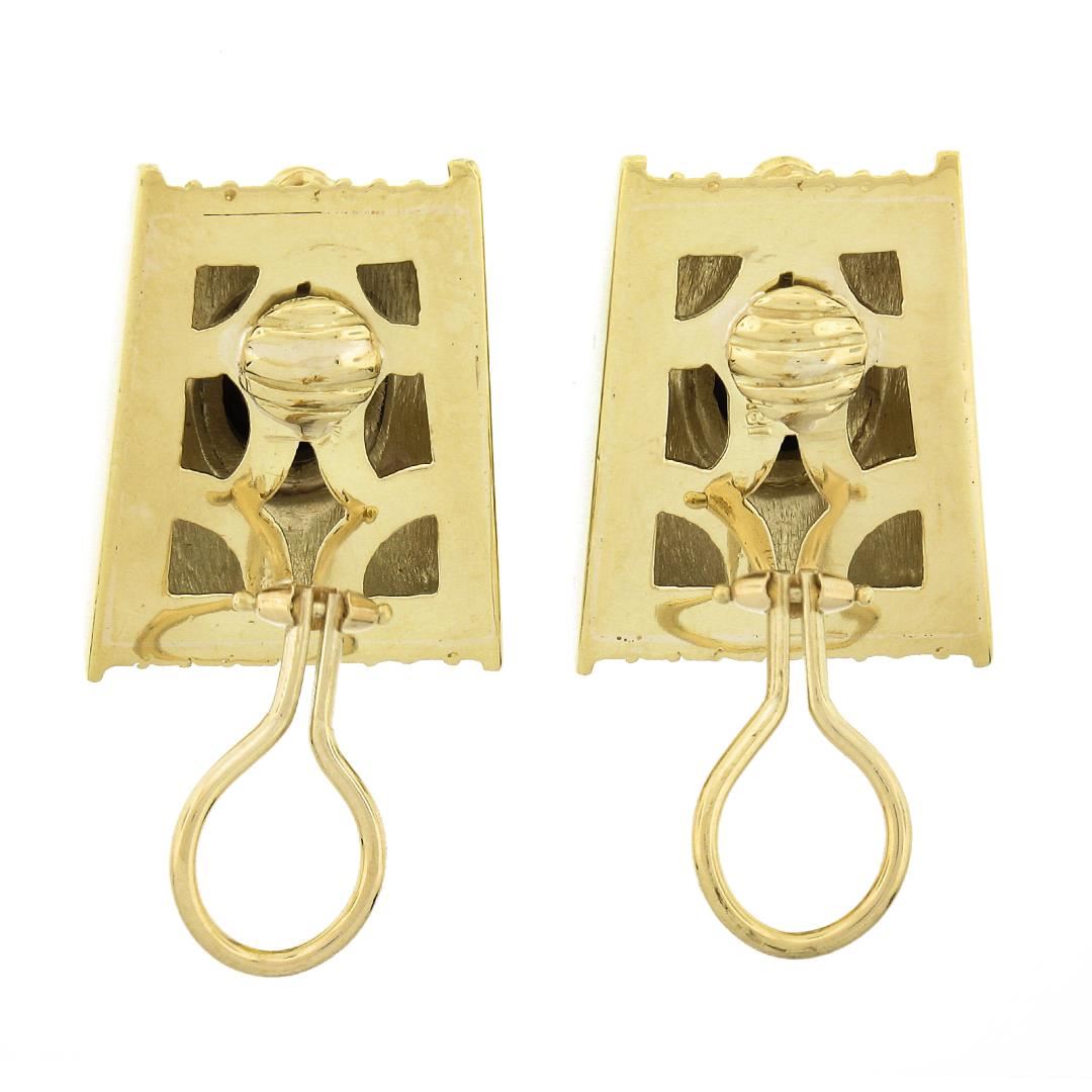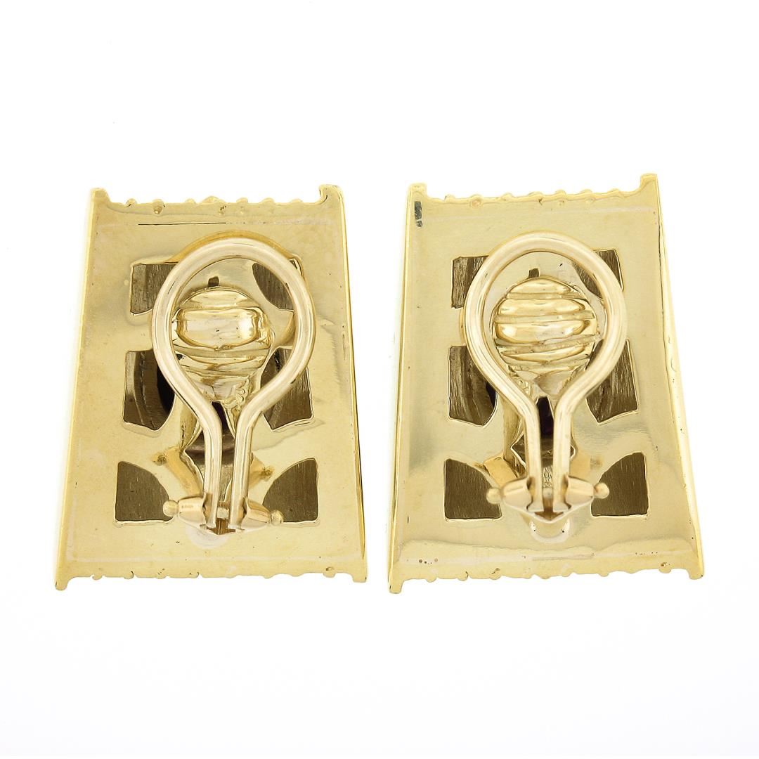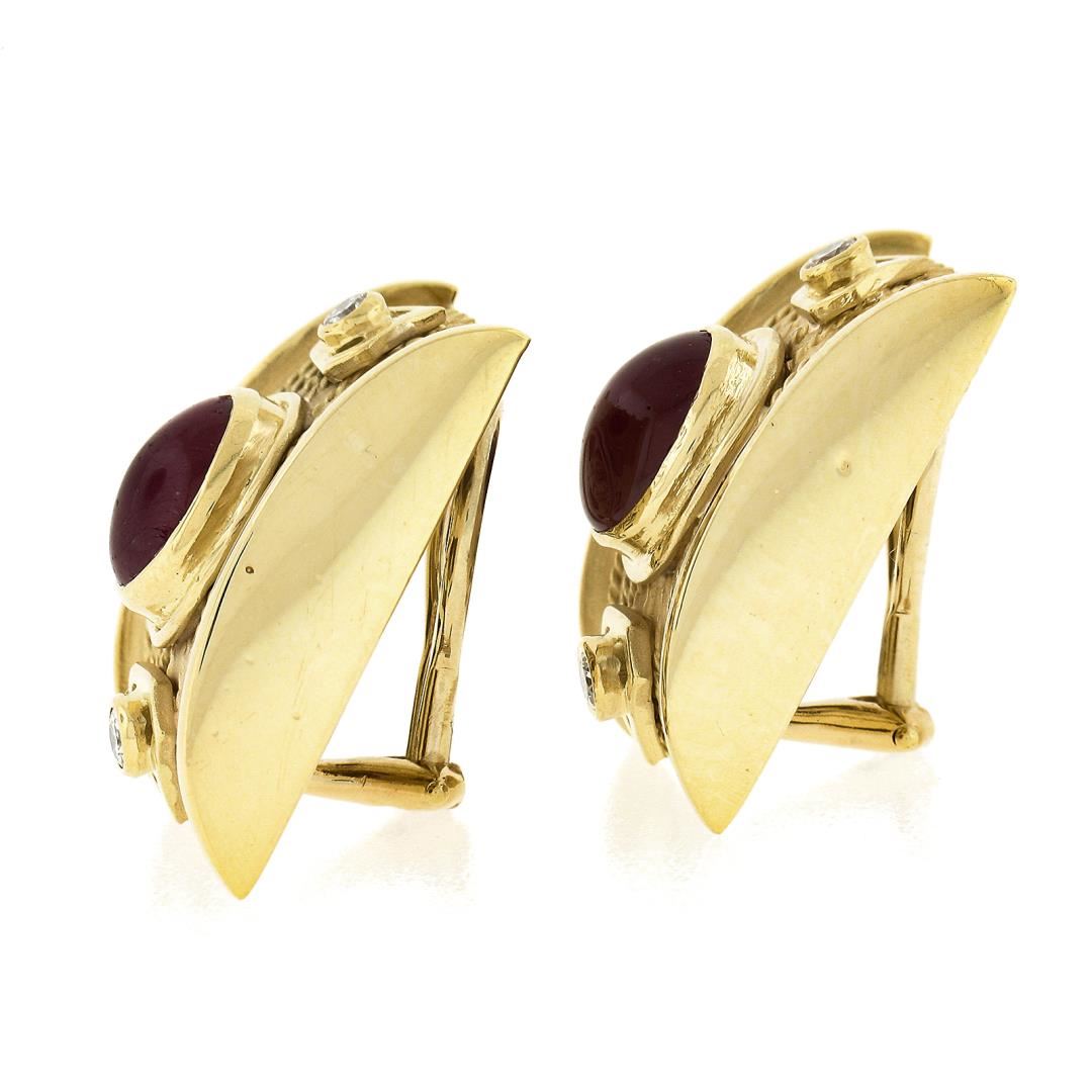 A solid 18k yellow gold clip on earrings, with 2 oval cabochon cut natural rubies (8.75x6.75mm each), and 4 round brilliant cut natural diamonds (F/G - VS1/VS2 ; 0.20ctw). The earrings measure approximately 23.7x18.4mm and weigh a total of 24.40 grams.