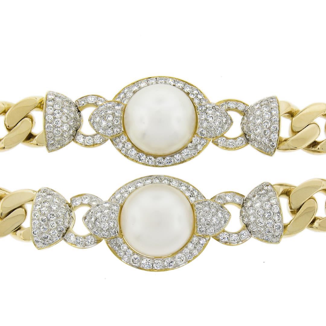 A solid 18k yellow gold set of necklace & bracelet, featuring 2 round shape cultured south sea pearls (16.7mm each), and numerous of round cut natural diamonds (G-I Color - VS1/VS2; 7.65ctw). the set weighs a total of 175.84 grams, the necklace measures 22.5mm wide, and measures 15.5 inches in length & the bracelet measures 21.8mm wide, and measures 7.25 inches in length