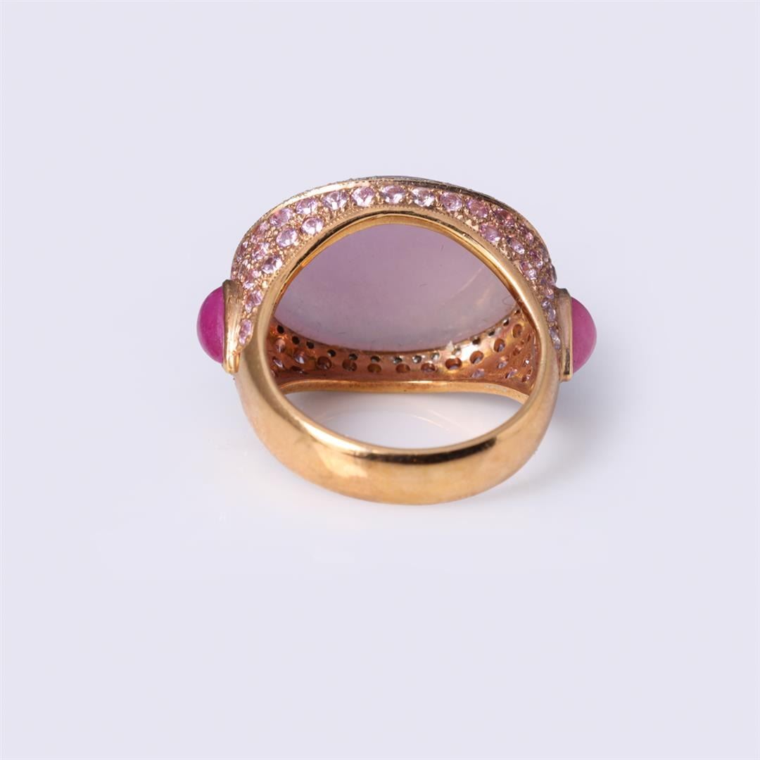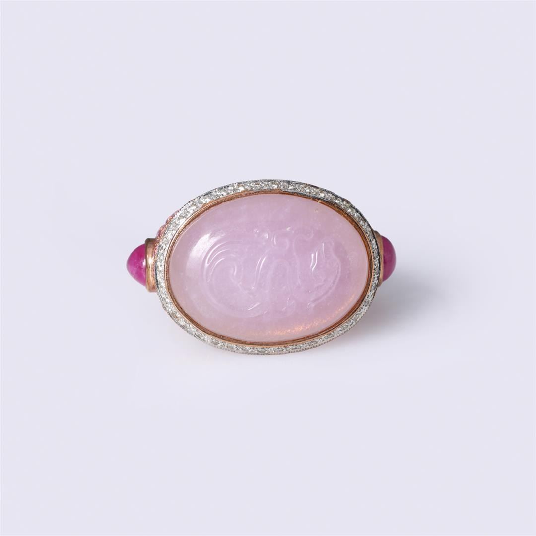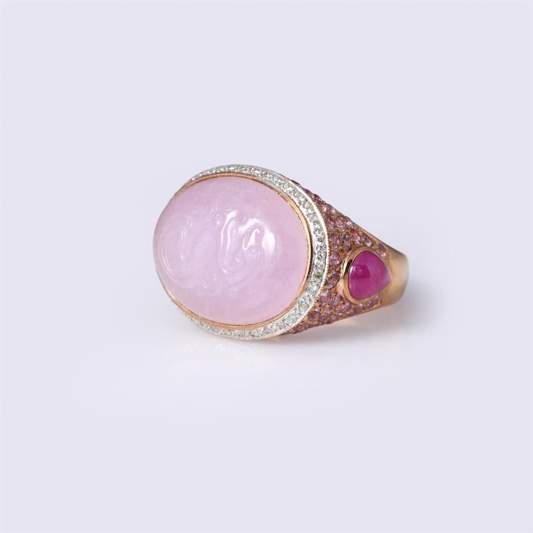 18k rose gold ring; the center cabochon a fine lavender jadeite with carving in relief set in oval bezel surrounded by single row of white diamonds, the shoulders with numerous pink sapphires and each side with teardrop ruby cabochon, designed by Carlo Ri