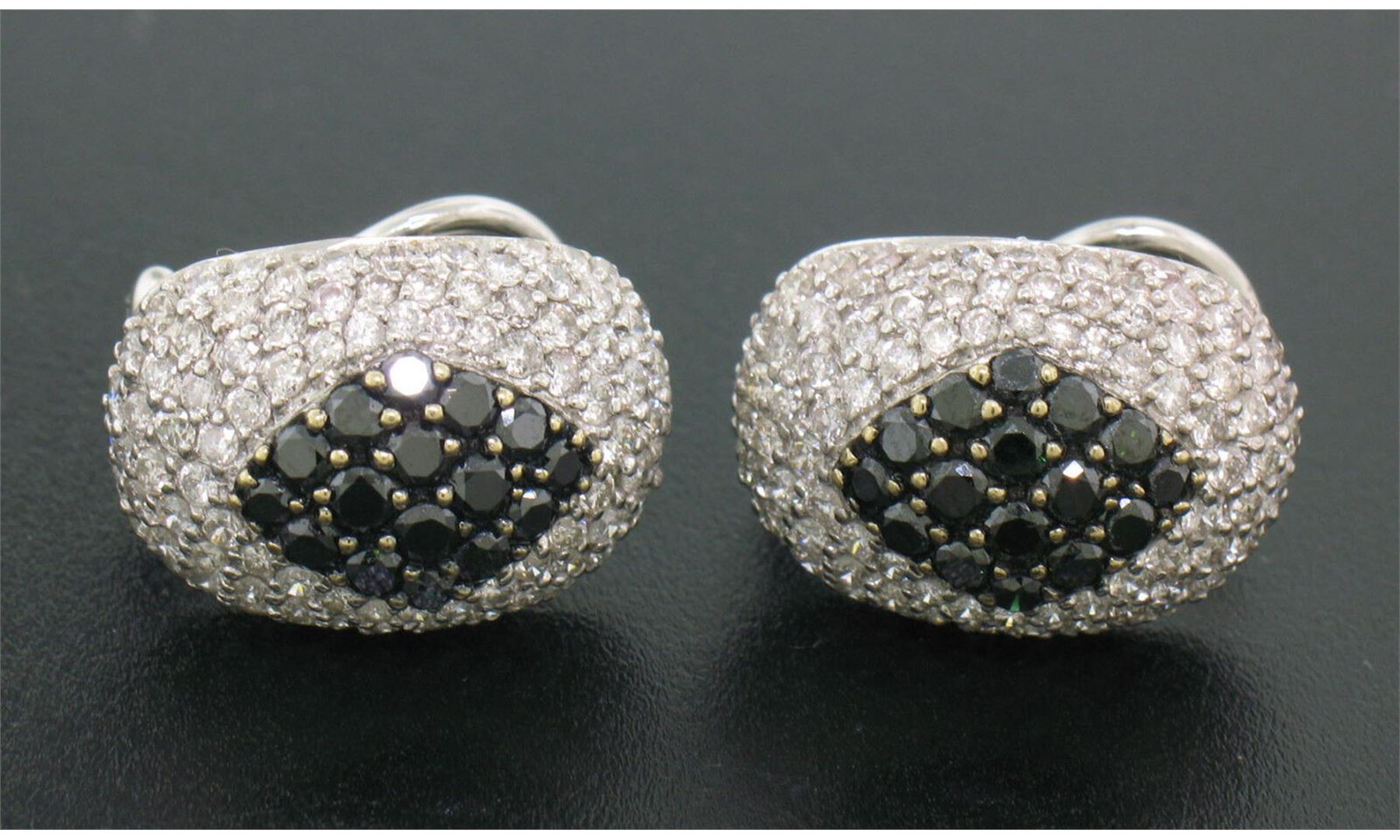 A new solid 18k white gold button earrings, with numeral of round brilliant cut natural black and white diamonds (G/H- VS2/SI1; 3.60ctw). The earrings measure approximately 18x13mm and weigh a total of 9.1 grams.