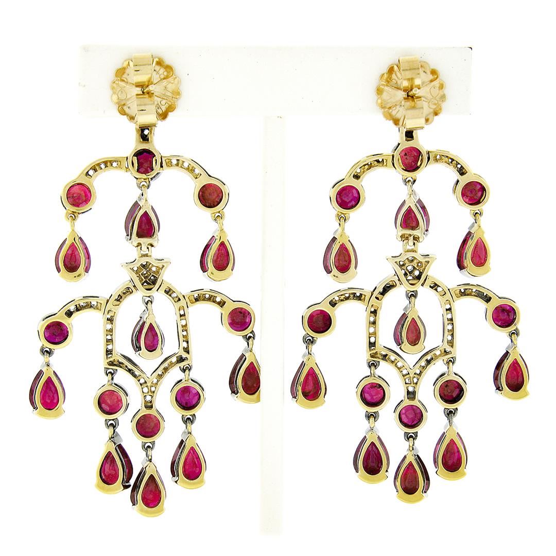 A pair of solid 18k yellow and black gold chandelier earrings, with 18 Gia certified pear cut natural rubies (11.0ctw), and 16 round brilliant cut natural rubies (4.80ctw), with 112 rose cut natural diamonds (H/I - VS2/SI1 ; 1.68ctw ). The earrings measure approximately 62.75x33.10mm and weigh a total of 25.45 grams. Comes with all original relevant certifications.