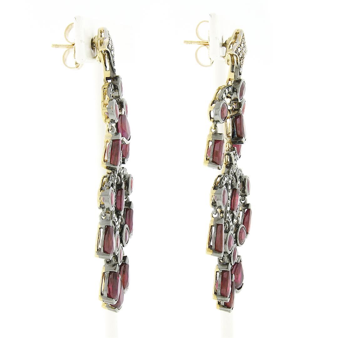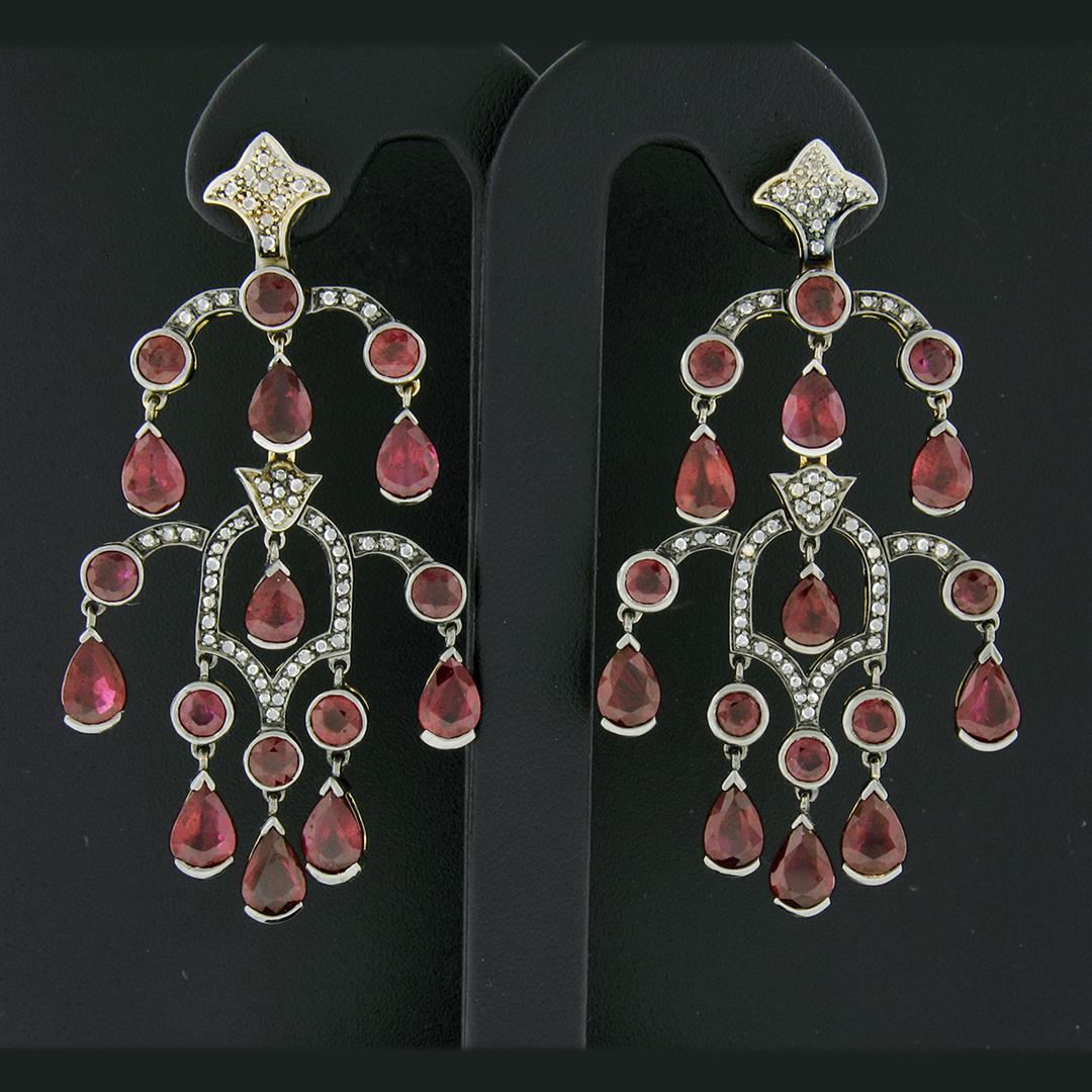A pair of solid 18k yellow and black gold chandelier earrings, with 18 Gia certified pear cut natural rubies (11.0ctw), and 16 round brilliant cut natural rubies (4.80ctw), with 112 rose cut natural diamonds (H/I - VS2/SI1 ; 1.68ctw ). The earrings measure approximately 62.75x33.10mm and weigh a total of 25.45 grams. Comes with all original relevant certifications.