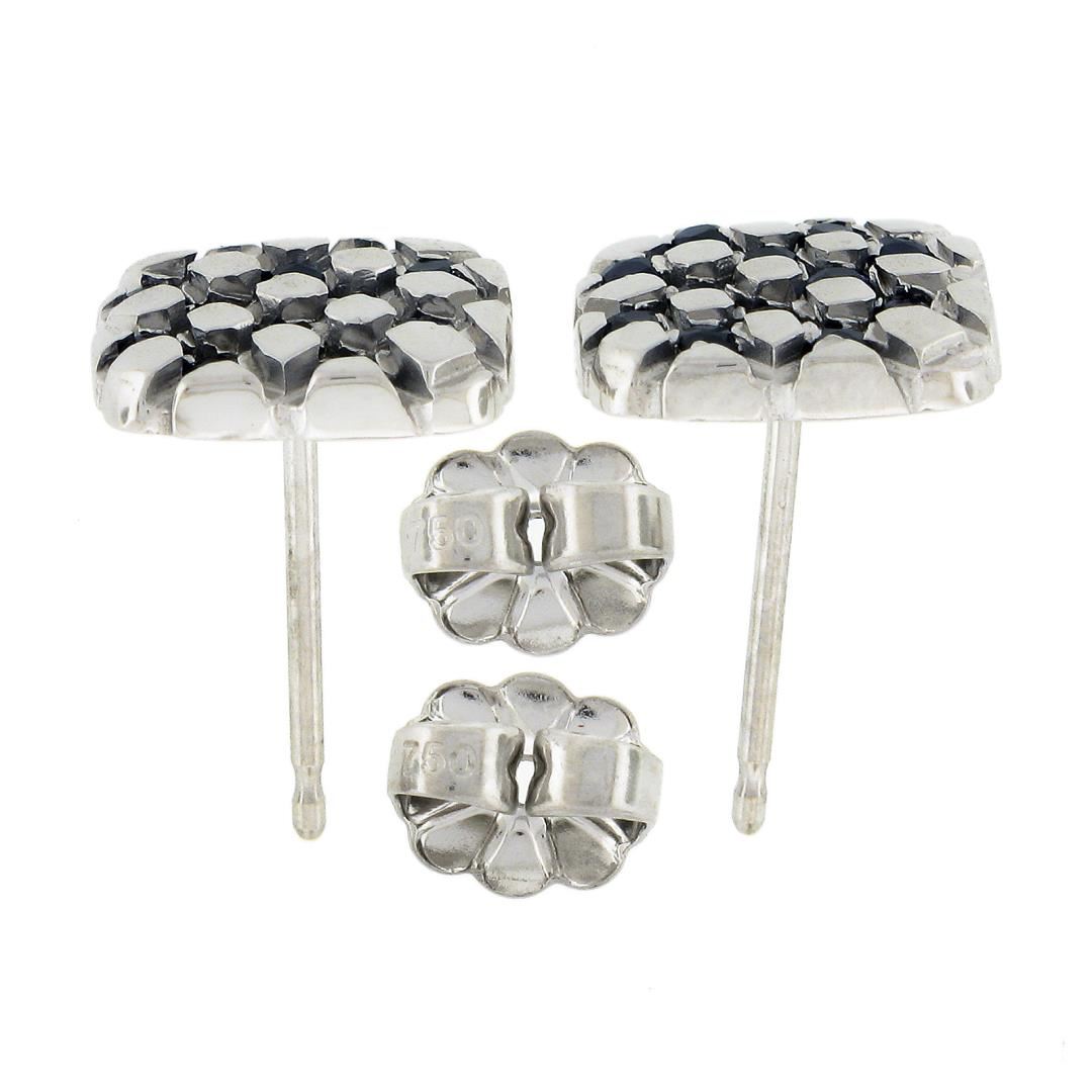 A solid 18k white gold stud earrings, with 24 round cut natural sapphires (0.36ctw). The earrings measure approximately 9.0x9.2mm and weigh a total of 3.30 grams.