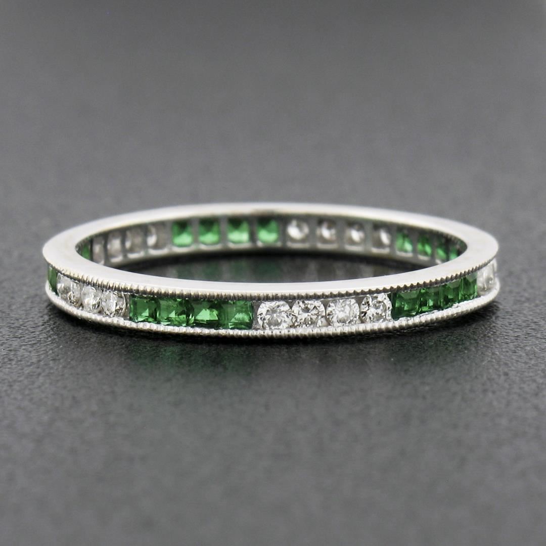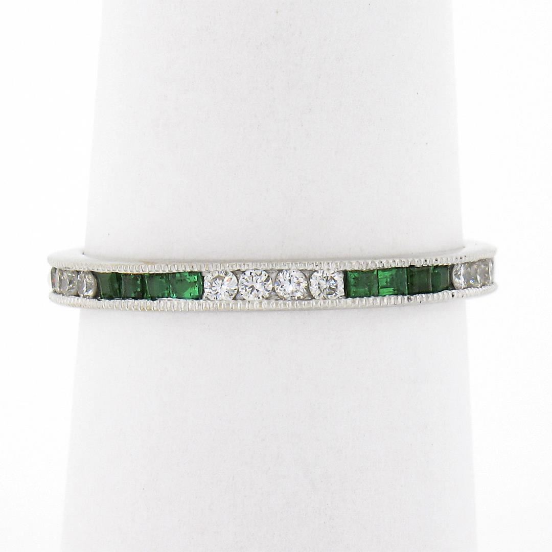 A solid 18k white gold band ring, with 20 square cut natural emerald (0.30ctw), and 20 round brilliant cut natural diamonds (G/H - VS1 ; 0.25ctw). The ring is size 6.5, weighs a total of 1.40 grams, and measures 2.3mm wide.