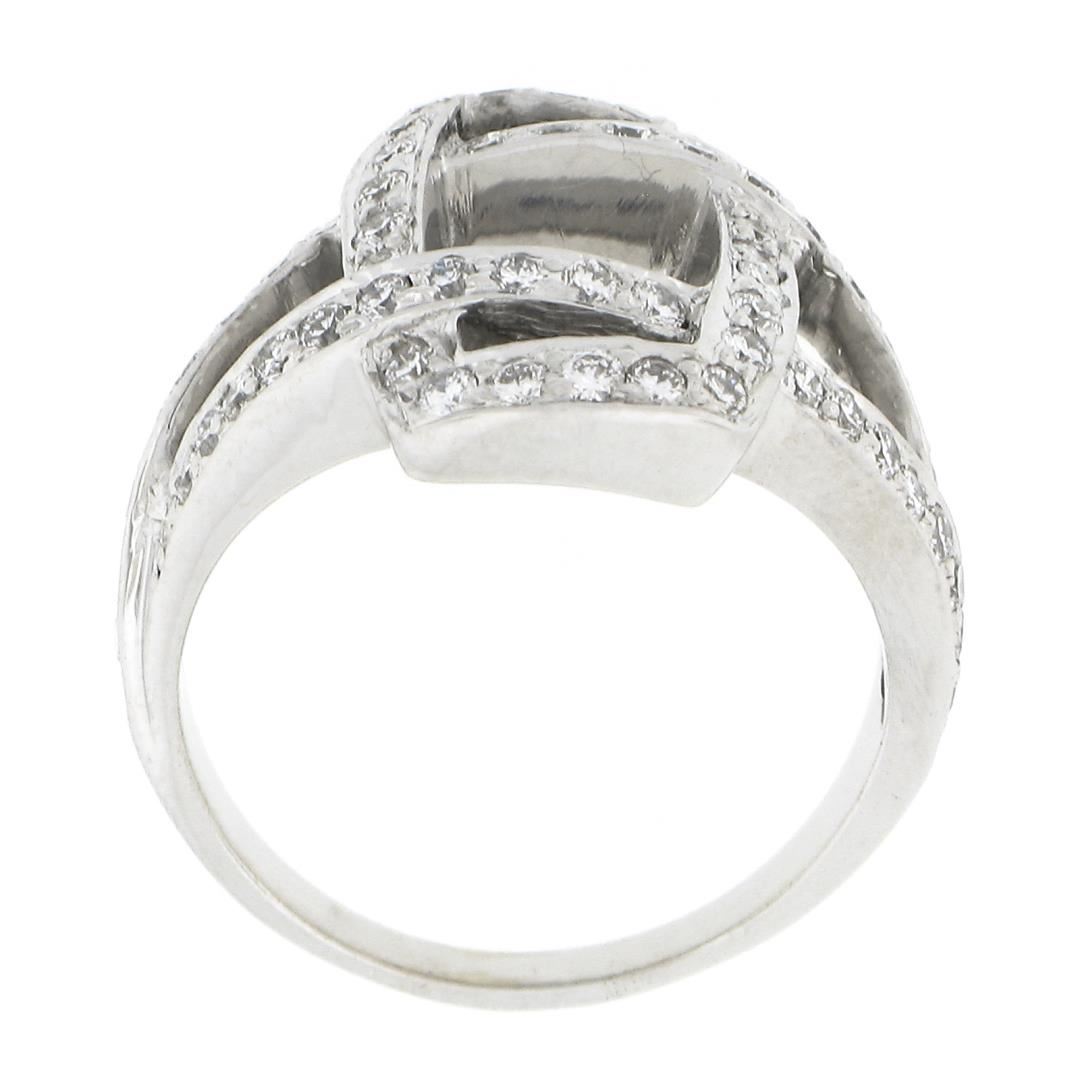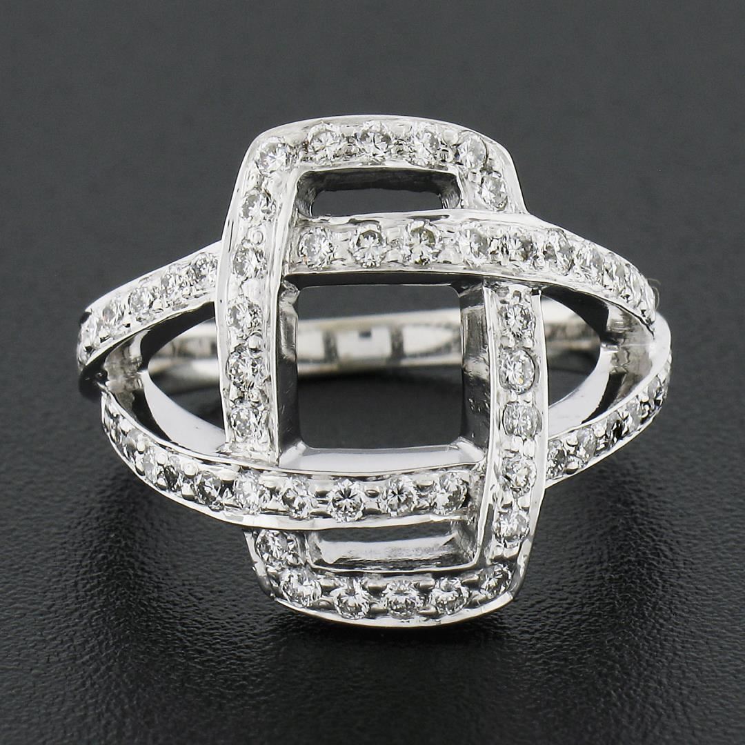 A solid 18k white gold interlocking ring, with 60 round brilliant cut natural diamonds (G/H - VS1/VS2 ; 0.78ctw). The ring is size 6.0, weighs a total of 6.63 grams, and measures 16.70mm wide.