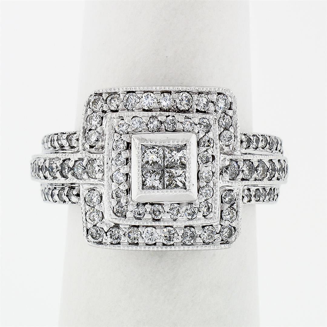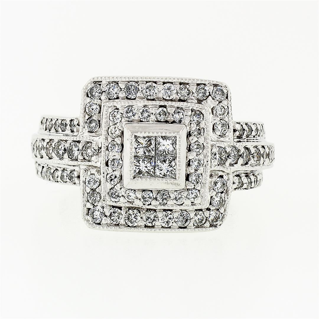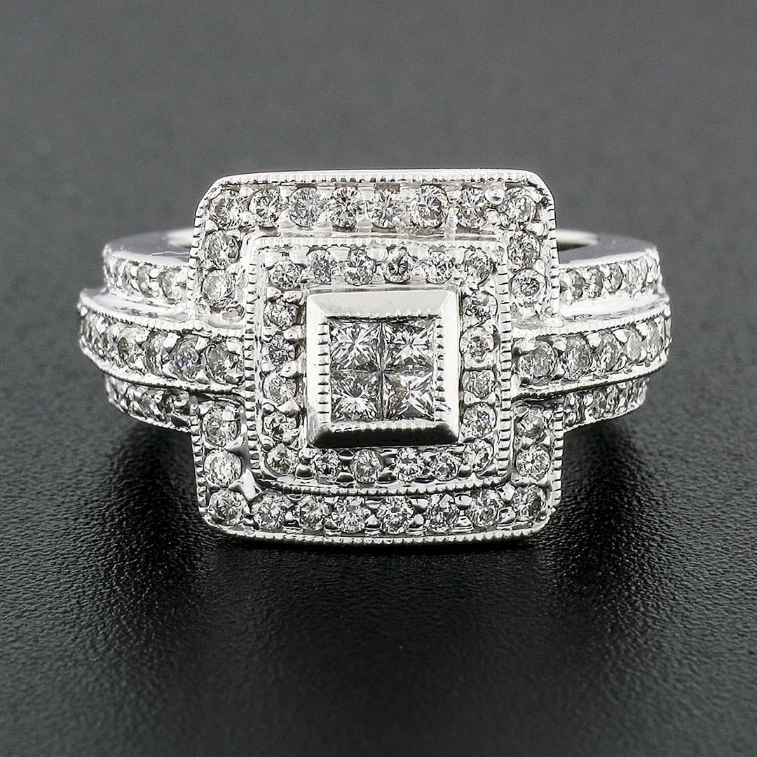 A solid 18k white gold tiered square cluster ring, with 4 square princess cut natural diamonds (G/H - VS2/SI1 ; 0.20ctw), and 90 round brilliant cut natural diamonds (G/H - SI1/SI2 ;1.00ctw). The ring is size 6.0, weighs a total of 13.26 grams, and measures 14.06mm wide.