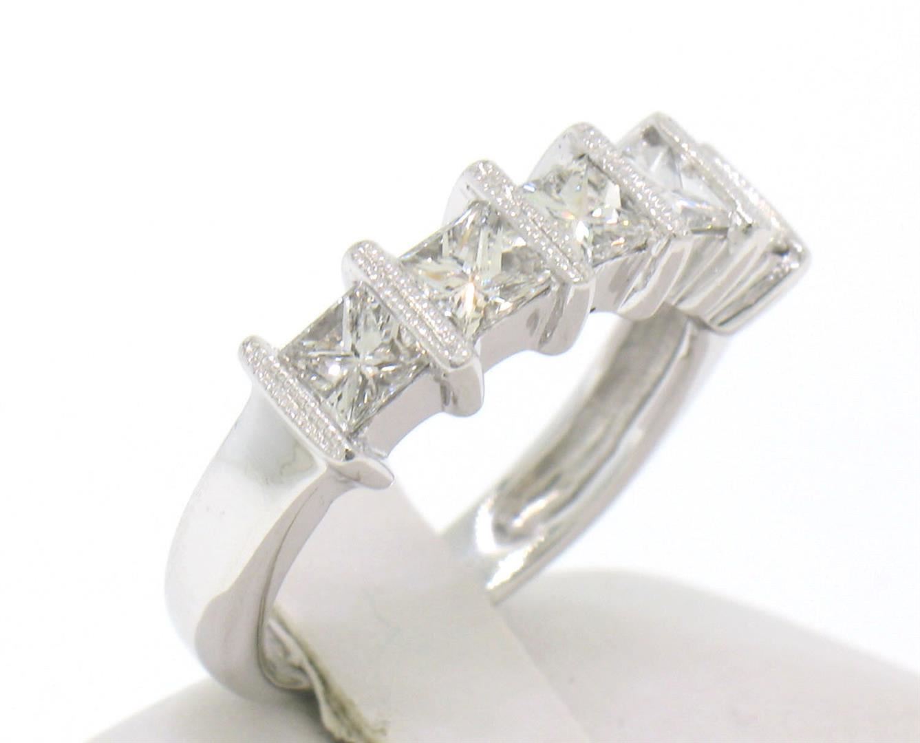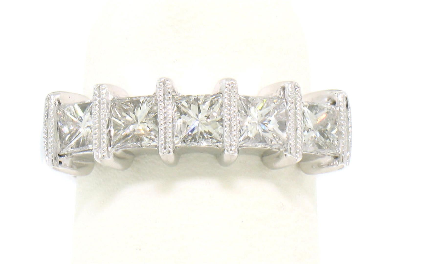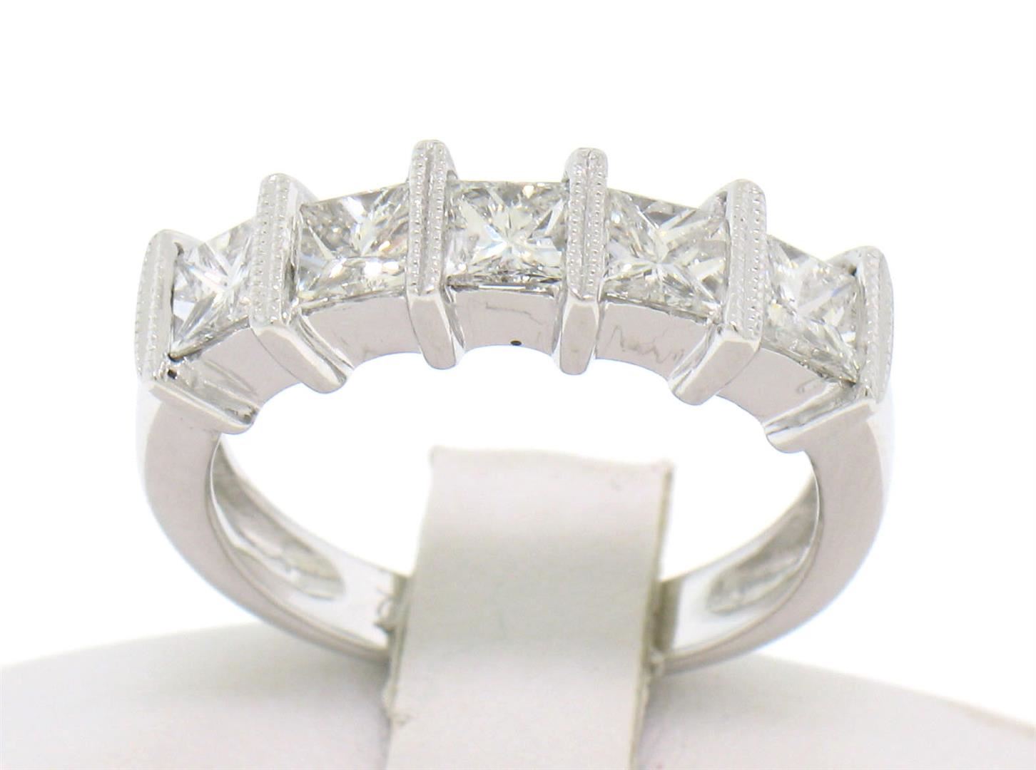 An estate 18k white gold band ring, 5 princess cut natural diamonds (G - SI1; 1.25ctw). The ring is size 4.5, weighs a total of 4.60 grams, and measures 5.30mm wide.