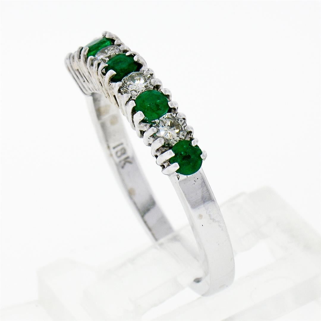 An estate solid 18k white gold stack band ring, featuring 10 round brilliant cut natural emeralds (0.80ctw), alernated with 8 round brilliant cut natural diamonds (F/G - VS1/VS2; 0.56ctw). The ring is size 5.5, weighs a total of 3.3 grams, and measures 3.75mm wide.