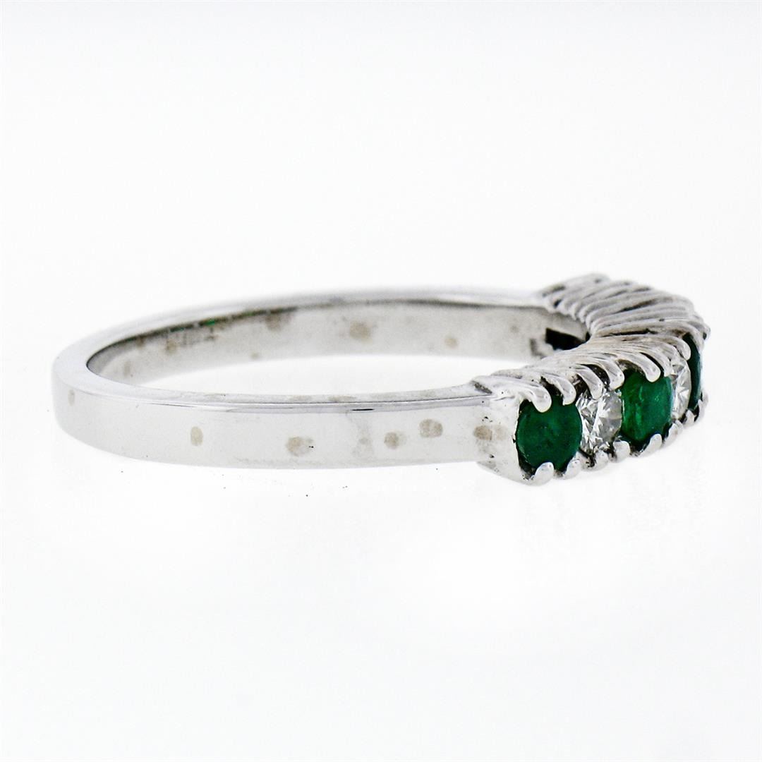 An estate solid 18k white gold stack band ring, featuring 10 round brilliant cut natural emeralds (0.80ctw), alernated with 8 round brilliant cut natural diamonds (F/G - VS1/VS2; 0.56ctw). The ring is size 5.5, weighs a total of 3.3 grams, and measures 3.75mm wide.