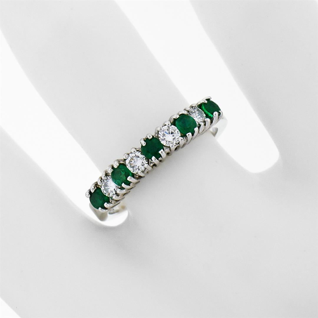 An 18k white gold band ring featuring 5 round brilliant emeralds (0.80ctw) and 4 round brilliant diamonds (F/G - VS1/VS2; 0.56ctw) set in an alternating pattern. The ring is size 6.5, weighs a total of 3.30 grams, and measures 3.75mm wide.