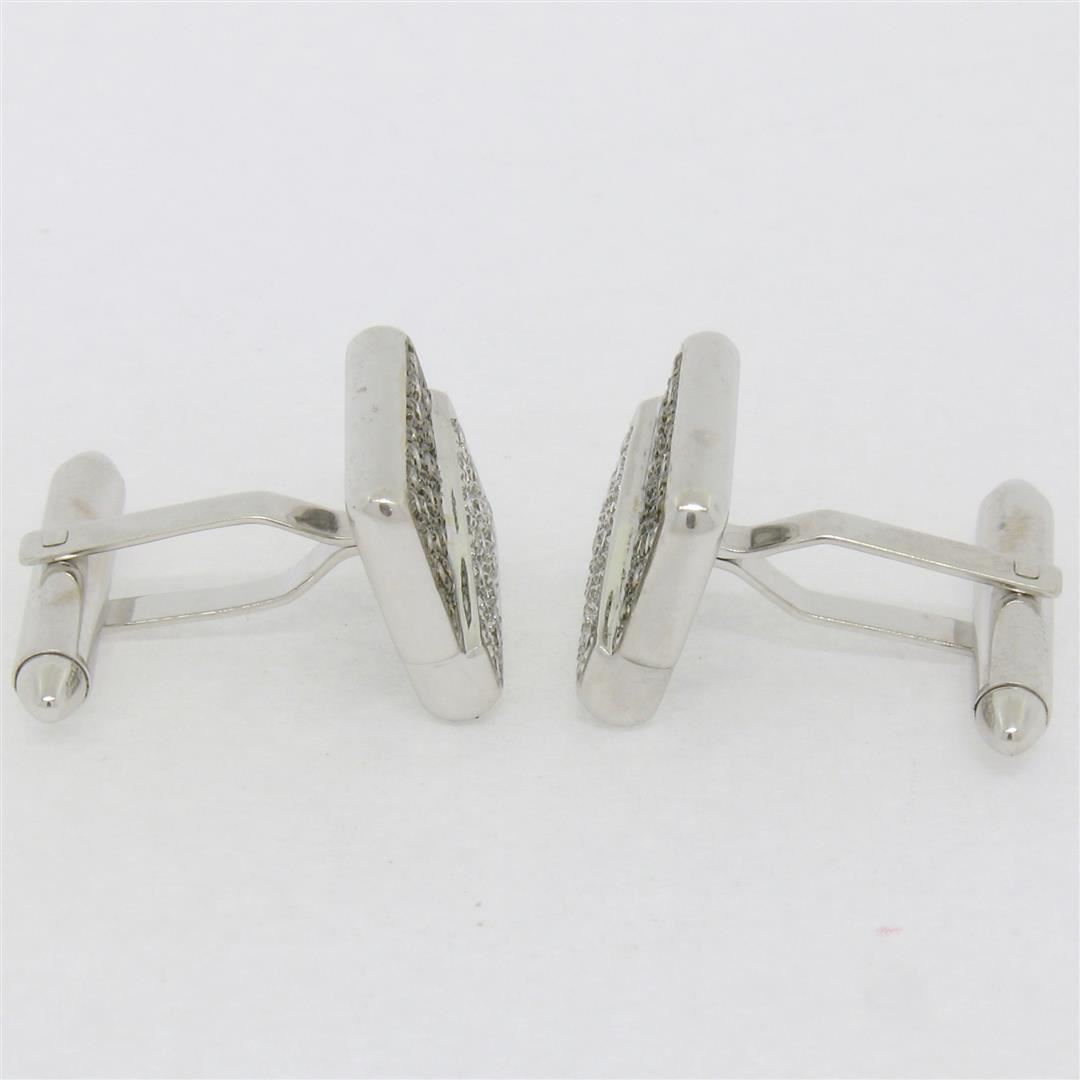 A pair of 18k white gold cuff links featuring 34 round brilliant white diamonds (G/H - VS2; 0.65ctw) and 40 round brilliant fancy champagne colored diamonds (VS1/VS2; 0.80ctw) pave set throughout their front panels. These cuff links have a swivel back des