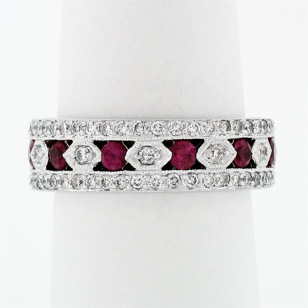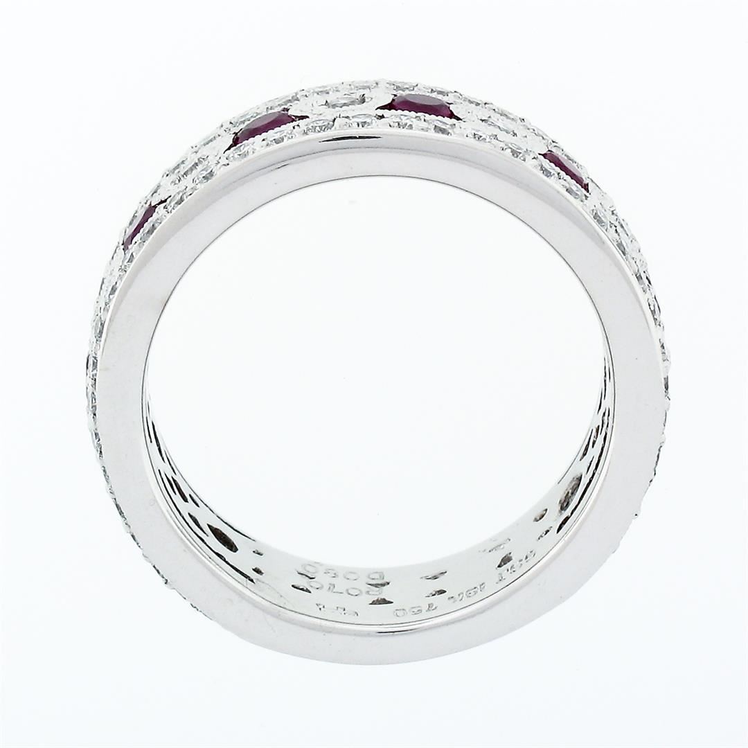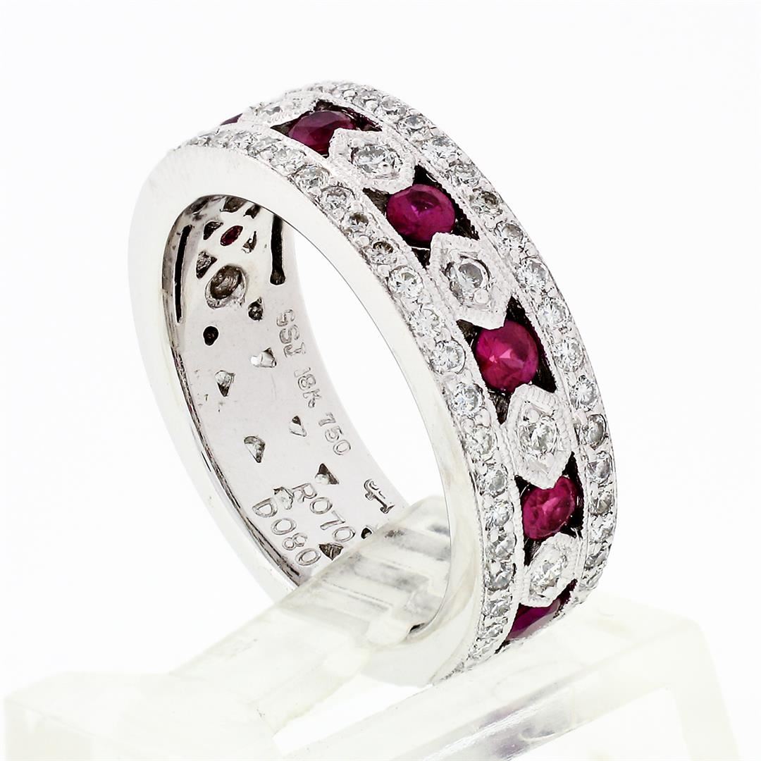 A solid 18k white gold band ring, with 8 round brilliant cut natural rubies (0.70ctw), surrounded with 81 round brilliant cut natural diamonds (G/H - VS1/VS2 ; 0.80ctw). The ring is size 7.0, weighs a total of 8.45 grams, and measures 6.52mm wide.