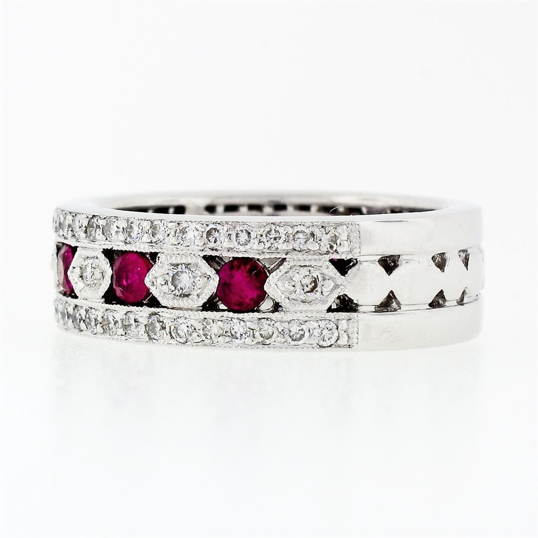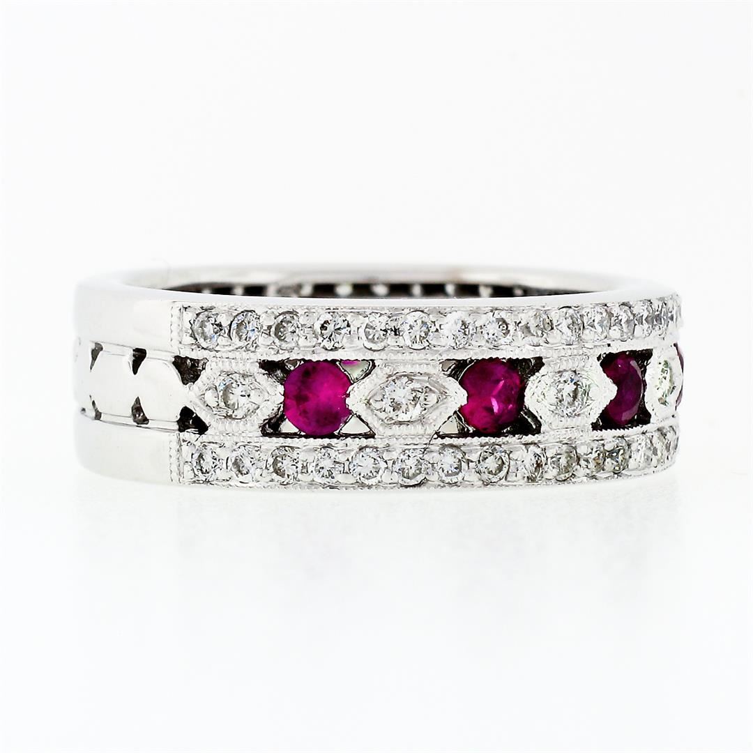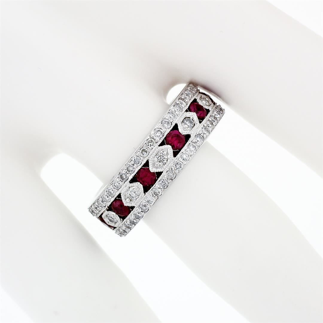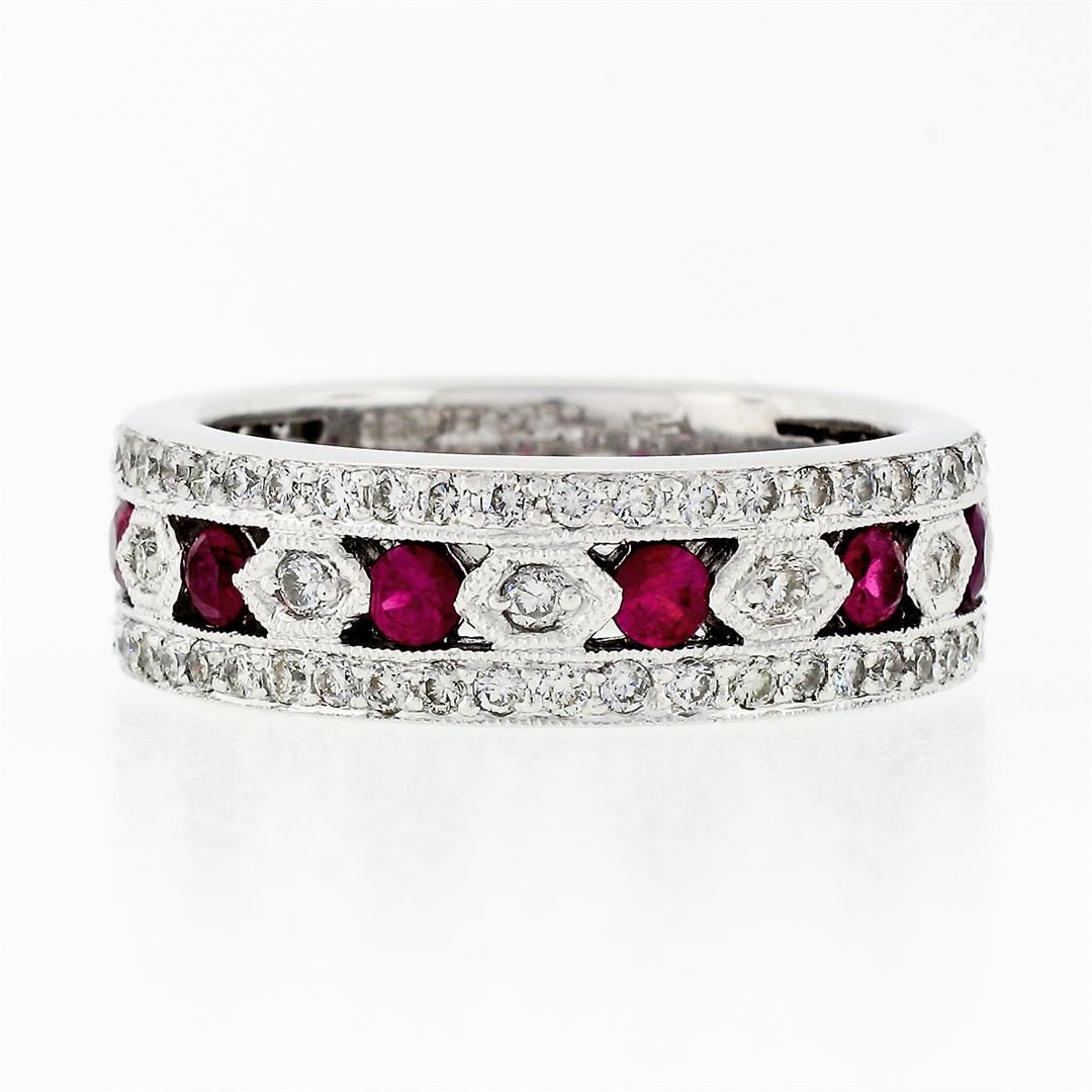 A solid 18k white gold band ring, with 8 round brilliant cut natural rubies (0.70ctw), surrounded with 81 round brilliant cut natural diamonds (G/H - VS1/VS2 ; 0.80ctw). The ring is size 7.0, weighs a total of 8.45 grams, and measures 6.52mm wide.