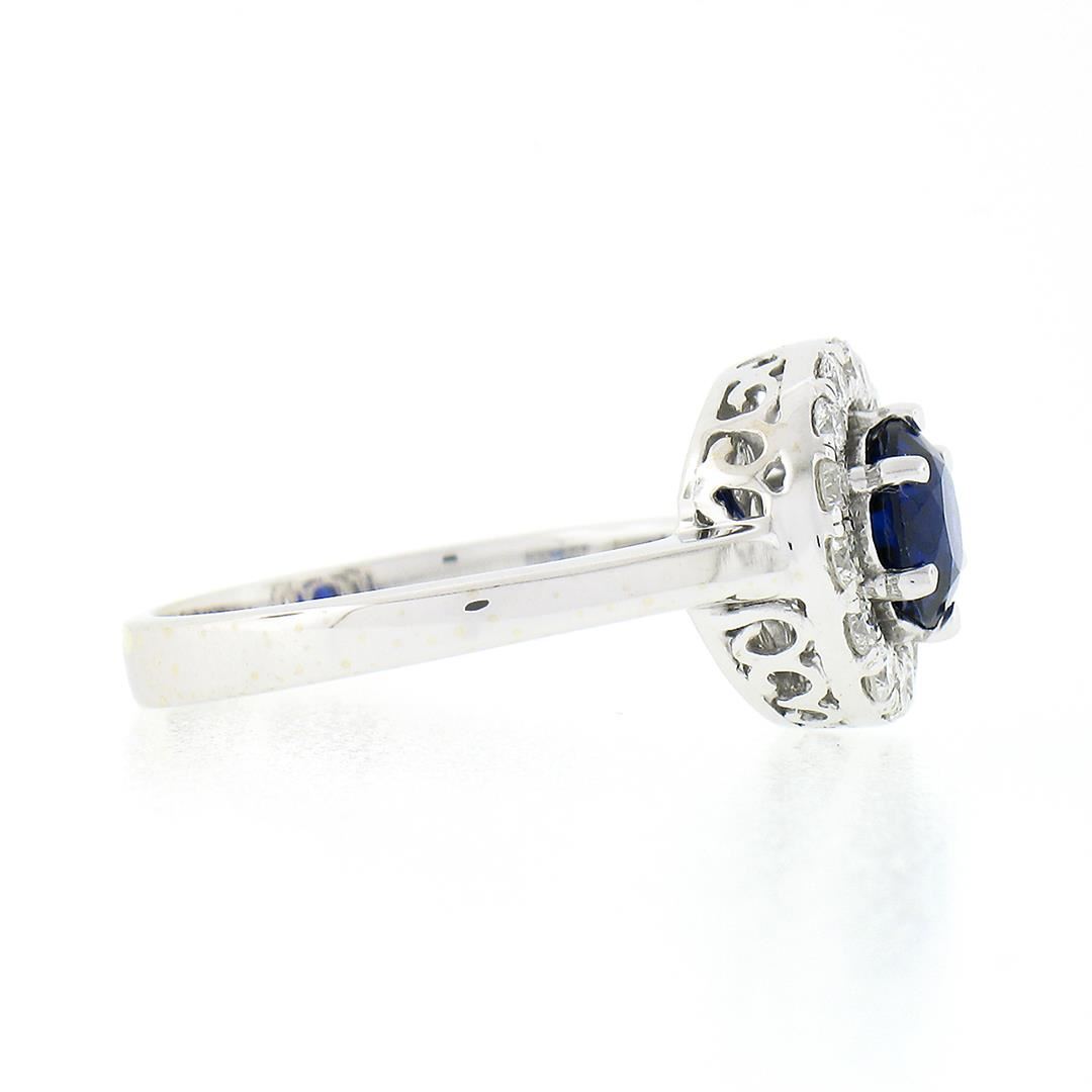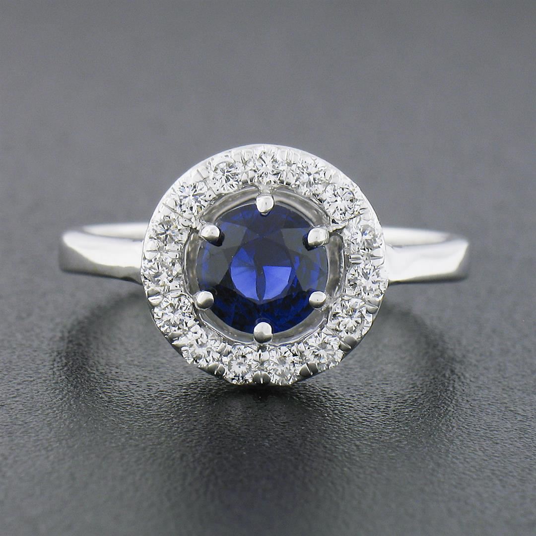 A solid 18k white gold cluster ring, with 1 round cut natural sapphire (6.0mm - 1.10ct), surrounded with a halo of 15 round brilliant cut natural diamonds (G/H - VS2 ; 0.45ctw). The ring is size 7.0, weighs a total of 4.40 grams, and measures 11.08mm wide.