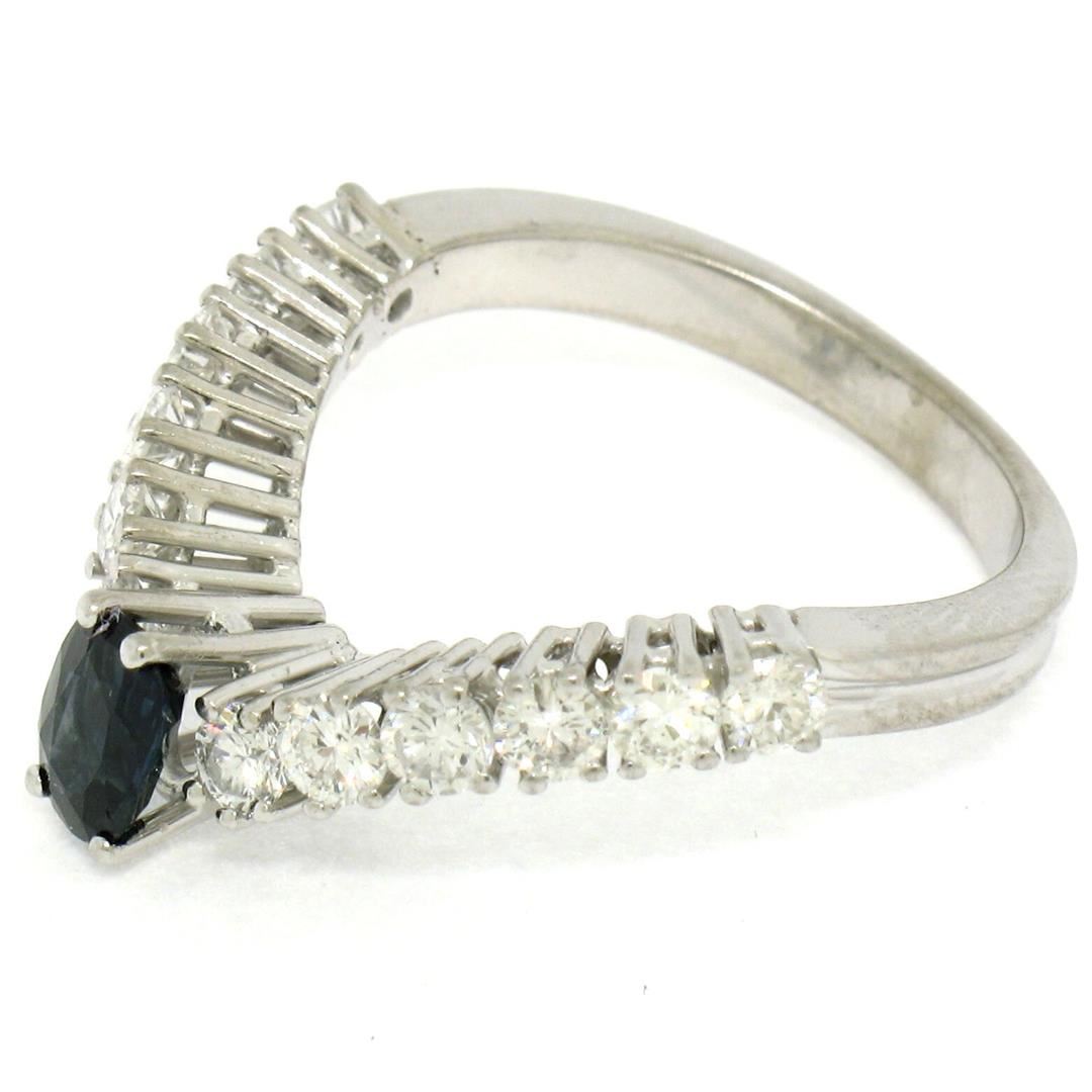 18k White Gold 1.64ctw Oval Sapphire Solitaire Round Diamond Chevron V Band Ring. Please see photos and description for all available information. An estate 18k white gold chevron V band ring, with 1 oval cut natural sapphire (0.56ct ), accented with 12 round brilliant cut natural diamonds (F/G- VS1/VS2; 1.08ctw). The ring is size 6.5, weighs a total of 4.54 grams, and measures 10.85mm wide.