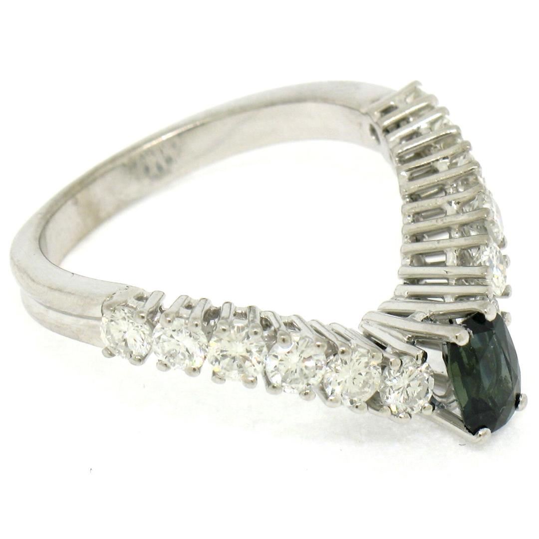 18k White Gold 1.64ctw Oval Sapphire Solitaire Round Diamond Chevron V Band Ring. Please see photos and description for all available information. An estate 18k white gold chevron V band ring, with 1 oval cut natural sapphire (0.56ct ), accented with 12 round brilliant cut natural diamonds (F/G- VS1/VS2; 1.08ctw). The ring is size 6.5, weighs a total of 4.54 grams, and measures 10.85mm wide.