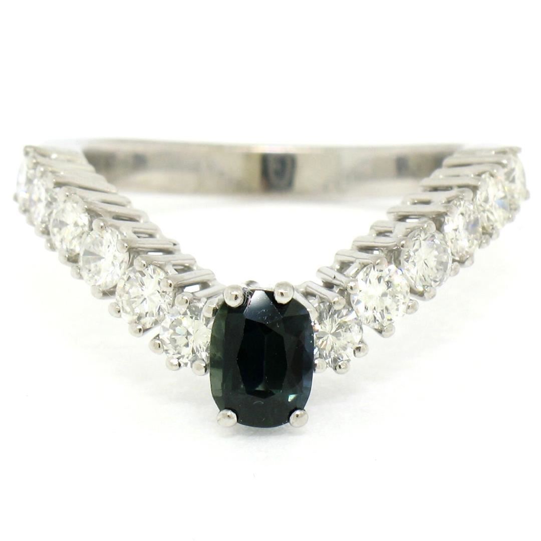 18k White Gold 1.64ctw Oval Sapphire Solitaire Round Diamond Chevron V Band Ring. Please see photos and description for all available information. An estate 18k white gold chevron V band ring, with 1 oval cut natural sapphire (0.56ct ), accented with 12 round brilliant cut natural diamonds (F/G- VS1/VS2; 1.08ctw). The ring is size 6.5, weighs a total of 4.54 grams, and measures 10.85mm wide.