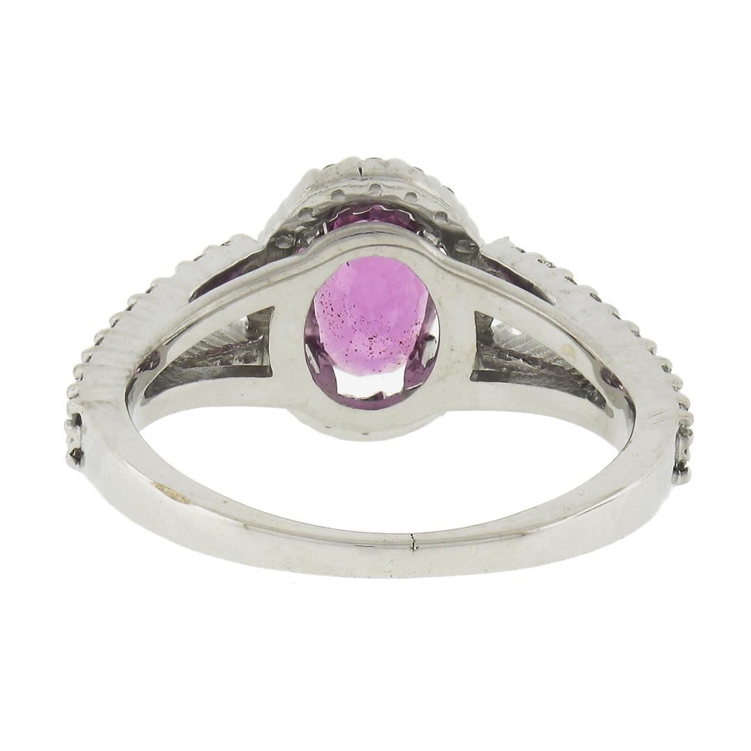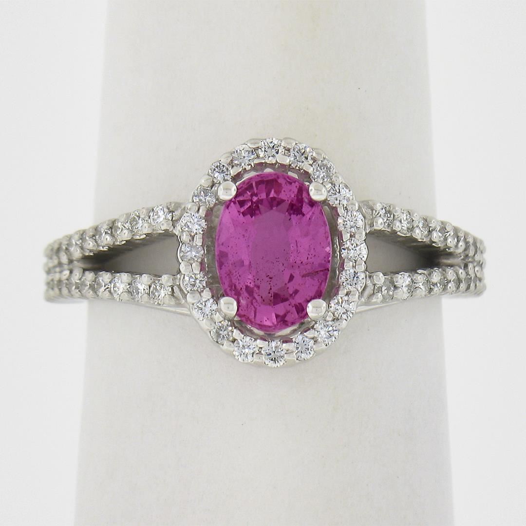 A solid 18k white gold ring, with 1 oval cut natural pink sapphire (1.11ct), and 60 round cut natural diamonds (G-I - VS2-SI2 ; 0.60ctw). The ring is size 6.0, weighs a total of 4.33 grams, and measures 10.5mm wide.
