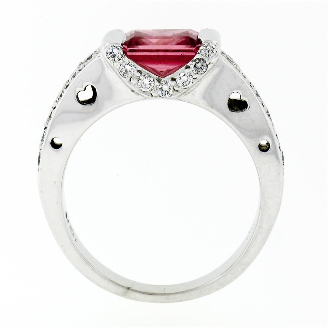 An estate solid 18k white gold sideways solitaire ring, with 1 emerald cut natural tourmaline (1.55ctw), and 26 round brilliant cut natural diamonds (G/H - VS1/VS2 ; 0.50ctw). The ring is size 7.5, weighs a total of 5.35 grams, and measures 5.78mm wide.