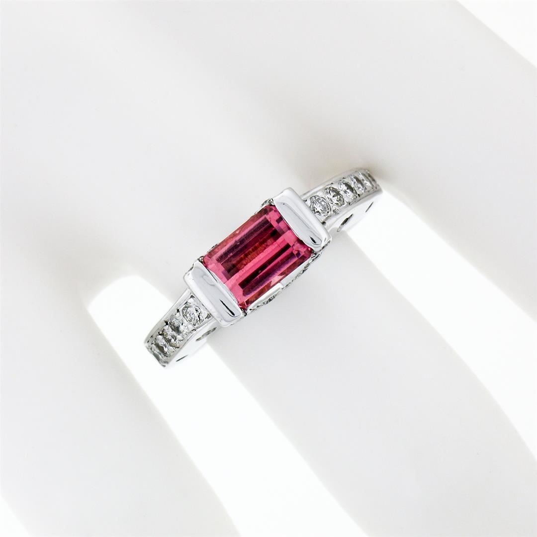 An estate solid 18k white gold sideways solitaire ring, with 1 emerald cut natural tourmaline (1.55ctw), and 26 round brilliant cut natural diamonds (G/H - VS1/VS2 ; 0.50ctw). The ring is size 7.5, weighs a total of 5.35 grams, and measures 5.78mm wide.