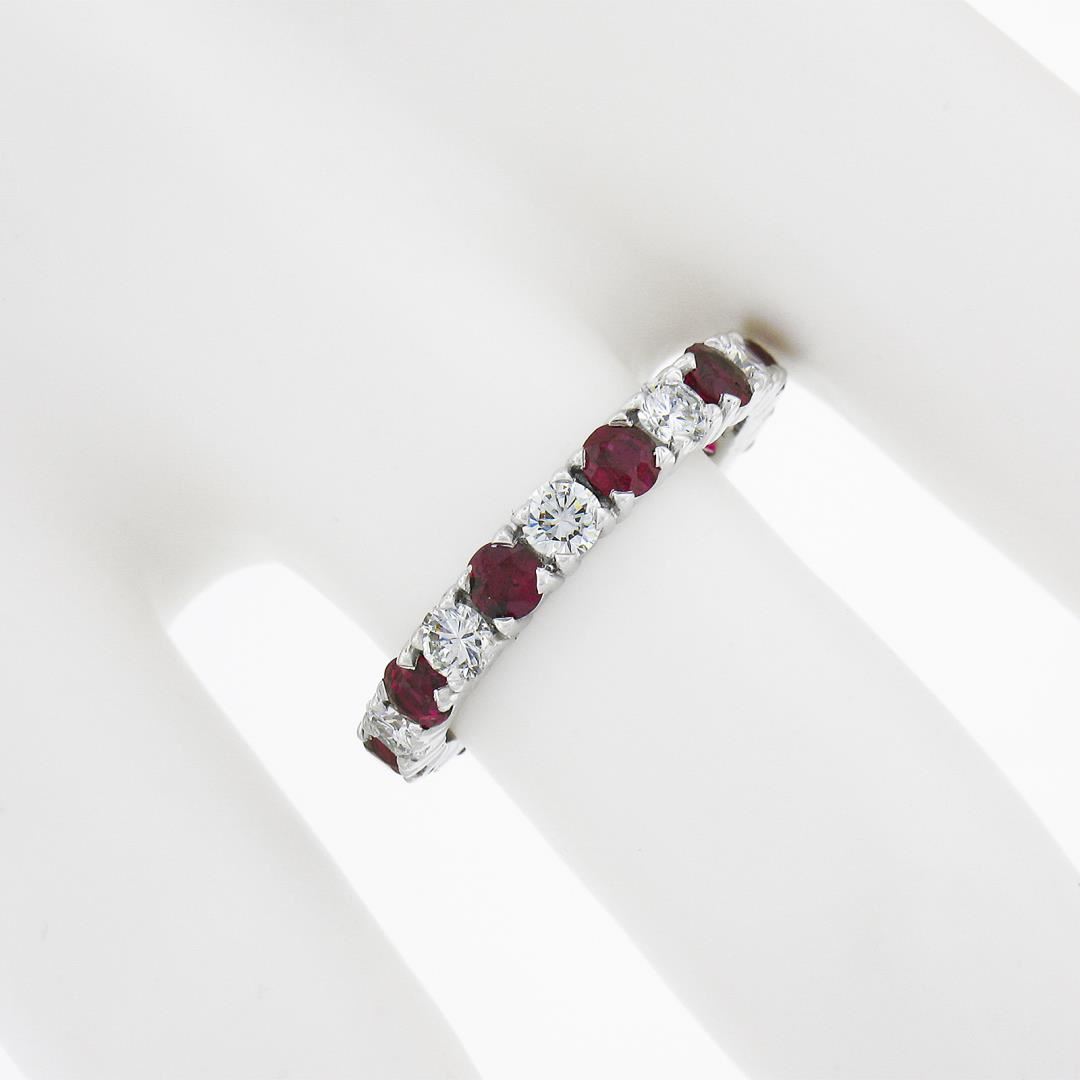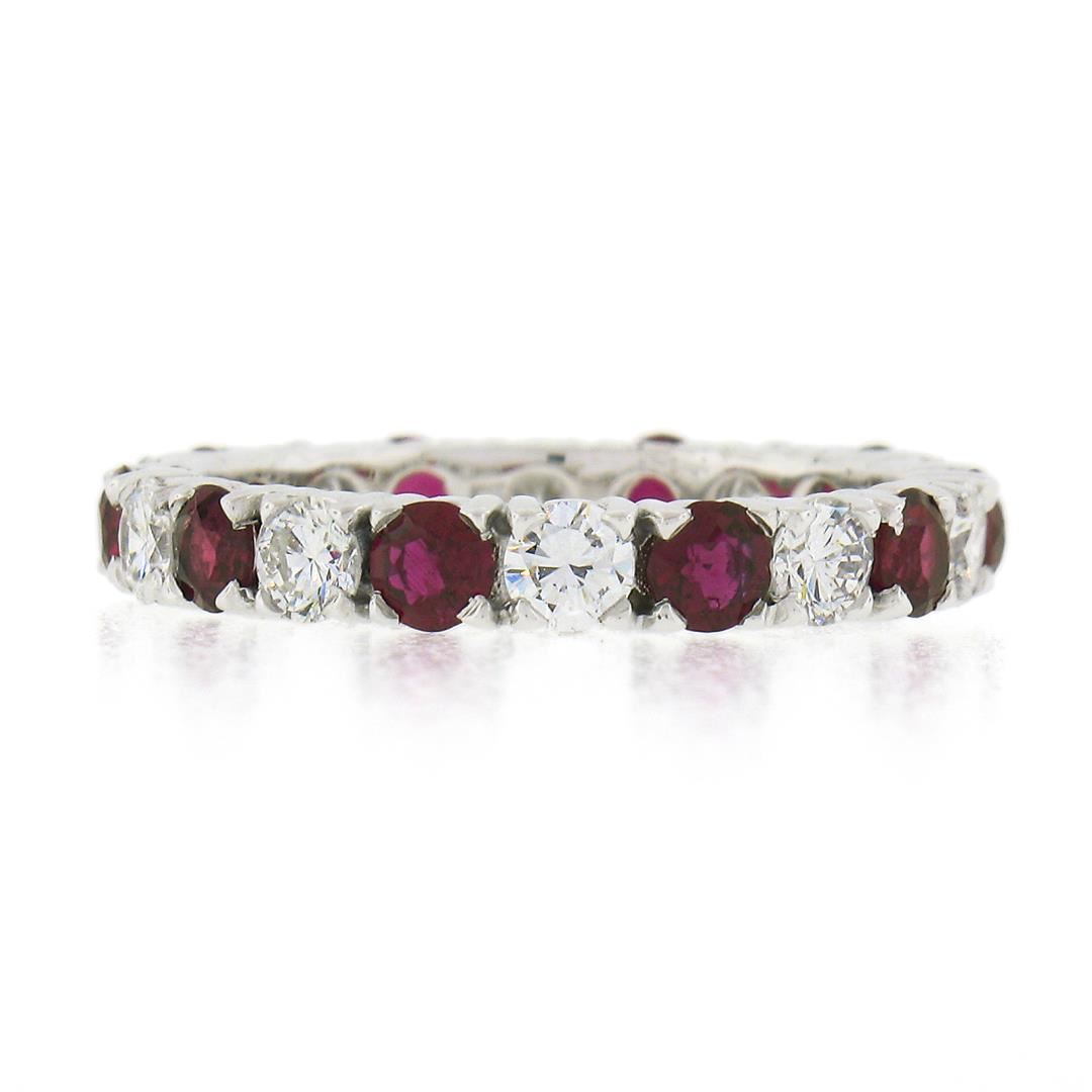 A vintage solid 18k white gold eternity band ring, with alternated 10 round brilliant cut natural rubies (1.30ctw), and 10 round brilliant cut natural diamonds (G/H - VS1/VS2 ; 0.80ctw). The ring is size 5.5, weighs a total of 2.57 grams, and measures 3mm wide.
